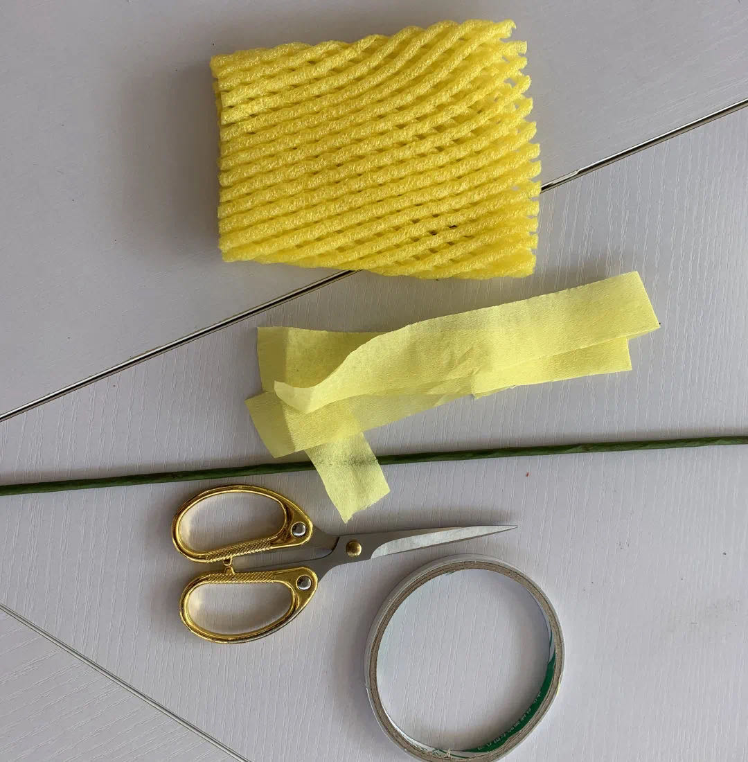 所需材料及工具: 水果网、皱纹纸、花杆(铁丝)、双面胶、剪刀  步骤: 1、剪一段宽度合适的黄色水果网,然后剪开。 2、在水果网的一侧末端贴上双面胶。再根据纹路剪断水果网之间相连的部分,全部剪好后撕下刚才贴的双面胶,放在一旁备用。 3、拿出花杆和黄色的皱纹纸,剪出叶子形状,从花杆底部开始缠绕,包裹花杆。 4、撕开双面胶,将花杆顶部粘在双面胶上,然后开始向内卷,慢慢沿着花杆朝下卷做成麦芒。 5、重复上述操作做出麦穗。 6、全部卷完后,用剪刀开始修剪水果网,再手动弯曲一下花杆,沉甸甸的麦穗就完成了。