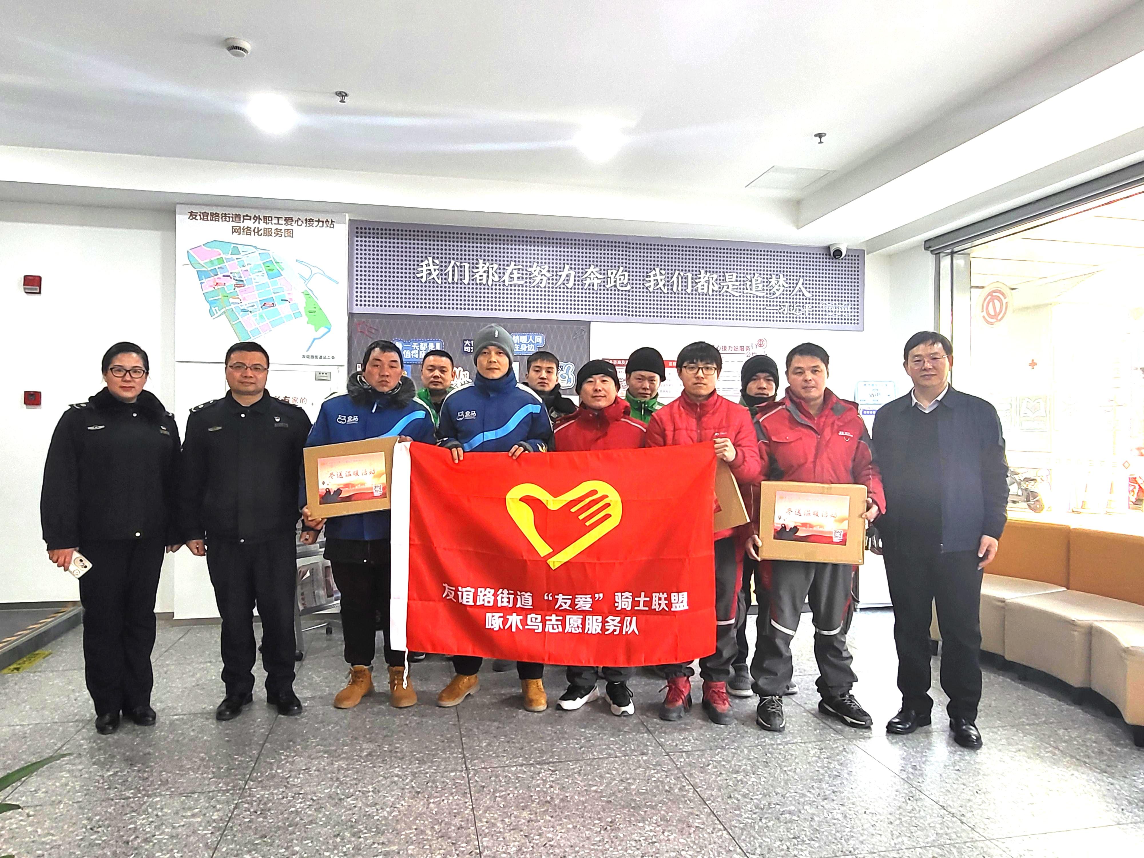 “啄木鸟”志愿服务队的李师傅表示:“在这寒冷的冬天,能收到街道总工会送来的围巾、帽子和手套,真的非常温暖,我们感到非常开心和感激。”  进入冬季,上海气温骤降,为了深入学习贯彻中国工会十八大和上海市十五次工代会精神,向一线职工表达深切关怀,友谊路街道总工会开展了“冬送温暖,爱在友谊”新春送温暖系列活动。此次系列活动旨在关爱和支持那些仍在一线坚守岗位的新就业形态劳动者、劳务行业、物流货运行业、物业行业等人员。系列活动内容丰富,包括开展腊八节主题活动、新春主题插花活动、赠送暖心物资等,在冬日里传递街道总工会的温暖。 以快递员、外卖小哥等新业态劳动者组成的“啄木鸟”志愿服务队,自成立以来,就积极融入社区治理,通过发现安全隐患、现场立即拍照、信息及时上传、城运中心处理这四个环节,构成了一个高效、完整的工作闭环。他们深度参与到社区治理中,不仅提升了社区的安全和文明程度,也与周边社区居民形成了良性互动,充分展现了他们的自我价值和社会价值。  今年1月18日和1月29日街道总工会分别开展了“温情腊八节,暖‘新’更暖心”冬送温暖主题活动和“暖春花语,骑手匠心”新春主题插花活动。“啄木鸟”志愿服务队队员参与到两次主题活动中,其中的张师傅分享了他的感受。 张师傅说道:“参加新春主题的插花活动,不仅让我的身心得到了舒缓,还让我感受到了春节喜庆的氛围,我觉得自己是社区的一份子,未来会更积极地参与到街道社区治理中。” 2月5日,街道总工会陪同区劳务行业工会一同走访慰问了上海友邑人力资源有限公司,为留沪过年的劳务工们送去了新春大礼包,礼包里有电影票、围巾、饭盒、热帖、保温杯等物品,在丰富劳务工们文化生活的同时,让他们感受到了工会组织浓浓的关爱与暖意。 街道总工会走访慰问城管协管、市场协管、安全巡查、物业抢修、保洁保安和消杀防疫等春节留沪务工人员。 街道总工会还陪同区总工会、区人社局相关领导走访慰问了物货运行业春节留沪务工人员。 在这寒冷的冬季,街道总工会的“冬送温暖,爱在友谊”新春送温暖系列活动为新就业形态劳动者、劳务行业、物流货运行业、物业行业等春节留沪务工人员送来了党和政府以及工会组织春天般的温暖,体现了人民城市重要发展理念,展现了街道总工会在促进社会和谐中起到的桥梁纽带作用,推动了城市朝着更加人文、温暖、和谐的方向发展,共同织就了一幅属于友谊路街道特有的冬日友爱图景。