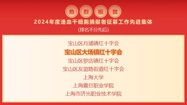 为进一步表扬先进,树立典型,倡导无私奉献、拯救生命的善举,推动社会主义精神文明建设,近日,中国造血干细胞捐献者资料库上海市分库印发《关于表扬2024年度上海市造血干细胞捐献工作先进集体、先进个人和特别支持奖的通知》。大场也上榜啦~   大场镇红十字运动起源距今已有近百年历史,1924年成立大场红十字分会,1965年建立大场镇红十字卫生站,2003年大场镇红十字会在宝山区社团局正式注册。2010年筹建成立全市第一家乡镇红十字服务中心。2019年6月,新建红十字服务中心并正式启用,实现了服务能力的全面提升。近年来,大场镇红十字会秉承“人道、博爱、奉献”的红十字精神,着力打造大场特色红十字品牌,先后获得全国优秀乡镇(街道)红十字会、上海市红十字示范镇、上海市红十字志愿服务先进集体、上海市红十字会先进集体、连续八年获得“造血干细胞捐献志愿者征募工作”先进集体等荣誉,成功创建上海市首批、宝山区第一家“博爱街镇”,并于2020年被评为“全国红十字模范单位”。 大场镇红十字会坚持 ★ 在组织建设上下实功,着力促进规范运作。 ★ 在阵地建设上出实招,着力夯实工作基础。 ★ 在人道服务上用实劲,着力打造特色品牌。 ★ 在人道传播上求实效,着力加大宣传力度。 大场镇将继续紧紧围绕城市社区博爱家园示范点建设的目标任务,全面按照实施方案要求,夯实工作基础,扎实推进红十字会核心业务,打造大场特色红十字品牌,将红十字工作扎根基层、服务群众,努力打造群众身边满意的红十字会。 |