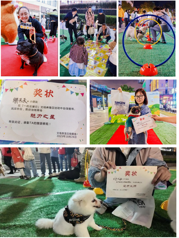 宠物秀场上,穿可爱小衣服的毛孩子走 T 台、秀 “握手”、“转圈” 才艺,萌得观众直欢呼,人人都抱走小礼品;“狗狗拒食挑战” 里,毛孩子抵制零食诱惑争当 “定力王者”,赢走零食大礼包,还 get 了安全小知识;“旋转达人” 比赛中,狗狗跟着节奏转圈圈,裁判认真计数,优胜者拿证书、抱礼包,就连纪念贴纸都让大家爱不释手~