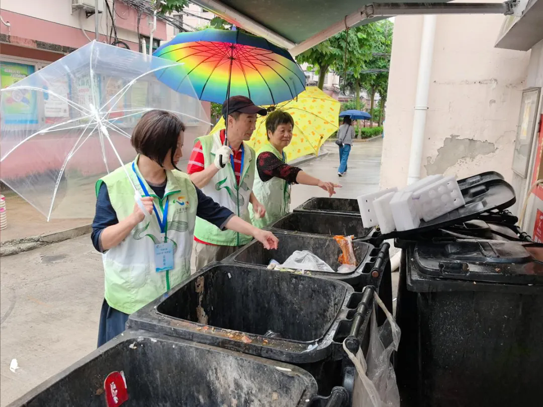 | 	 六月的吴淞,细雨绵绵的梅雨季挡不住绿色浪潮的奔涌。为全力推进垃圾分类工作,让绿色低碳理念深植居民心间,共建美丽宜居家园,吴淞街道积极发挥政府主导作用,由街道建管中心牵头,联合各居民区组建了一支市民垃圾分类“帮帮团”。“帮帮团”队伍成员迎着霏霏细雨,正式开启首次社区垃圾分类巡访之旅。活动当日,大家热情高涨,迅速集结后分成五组奔赴各网格区域。他们中,有热心社区事务的退休党员,有积极参与公益的社区志愿者,还有充满活力的青年居民代表,大家因对家园的热爱与守护环境的共同信念汇聚在一起。在垃圾分类箱房检查现场,“帮帮团”成员们化身“啄木鸟”,秉持着严谨细致的态度,对照分类标准展开了“地毯式”检查。他们弯下腰,仔细查看垃圾桶内垃圾的分类纯净度,生怕错过一袋混投的垃圾;踮起脚,认真检查分类标识是否清晰醒目,是否存在褪色、模糊的情况;伸手推拉垃圾桶,测试其是否存在损坏、卡顿现象;打开洗手装置,查看水流是否通畅,能否正常使用……每一个细节都不放过,一旦发现问题,便立即拍照留存,并认真做好记录。