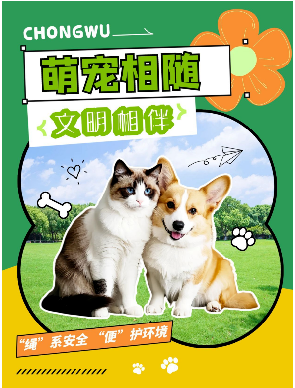 彩虹牵引绳 	像给毛孩子系上 “安全小腰带”!不管是蹦蹦跳跳的小狗狗,还是爱钻草丛的小猫咪,牵紧绳子既能避免跑丢,又能不让路人受惊,还能顺便解锁 “遛弯穿搭” 新风格~ 	便携拾便袋 	“便便不落地,环境超美丽!” 自带可爱图案的拾便袋,用完随手丢进垃圾桶,再也不怕毛孩子 “留下小麻烦”,做有素质的 “铲屎官搭子”~ 	小零食奖励 	遇到小朋友想摸一摸时,先拿出零食引导毛孩子乖乖坐下,温柔互动超加分!要是宝贝有点害羞,轻轻抱起来避开,也是超贴心的选择呀~