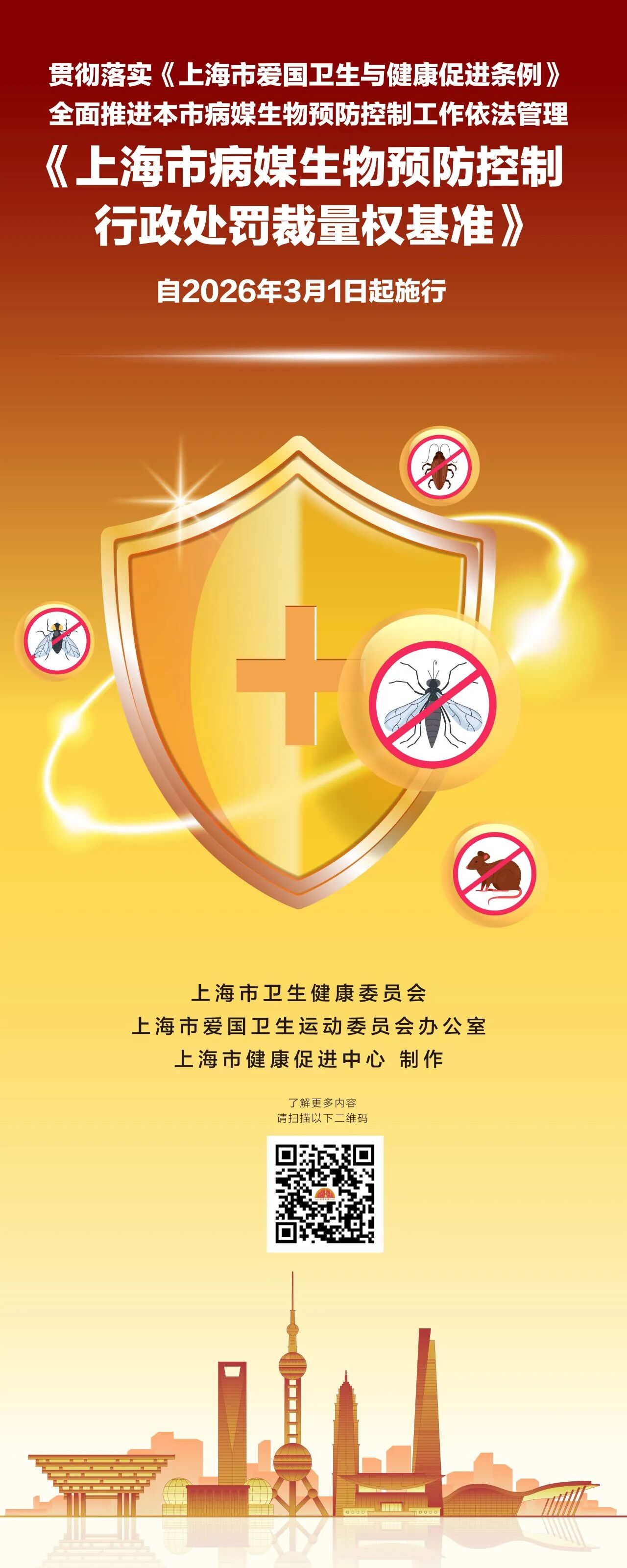 宣贯新规明准则,线上科普入人心 2026年3月1日起《上海市病媒生物预防控制行政处罚裁量权基准》即将施行,这里附上该基准文件以及涵盖九大场所的单位病媒生物风险点和相关防制措施指引。相关单位可提前熟悉新规要求,对照落实主体责任,规范自身病媒生物防制工作;市民朋友们也能从中学习到病媒生物防制技巧,共同营造科学防制的良好氛围。