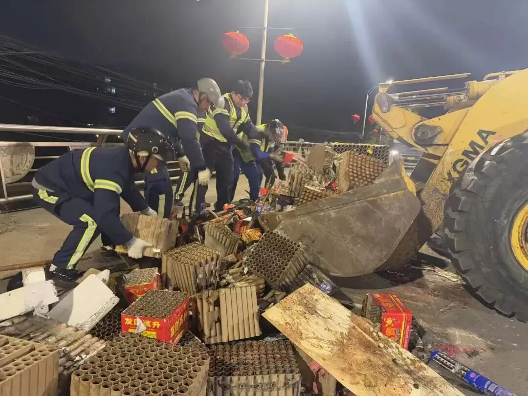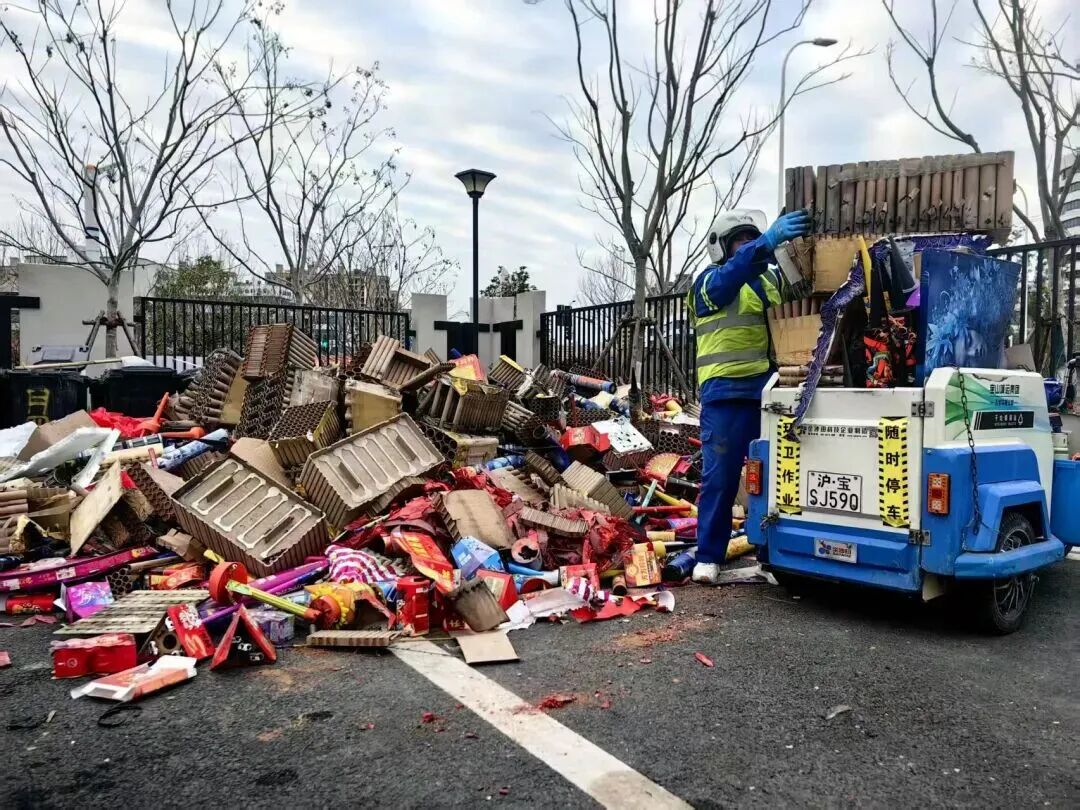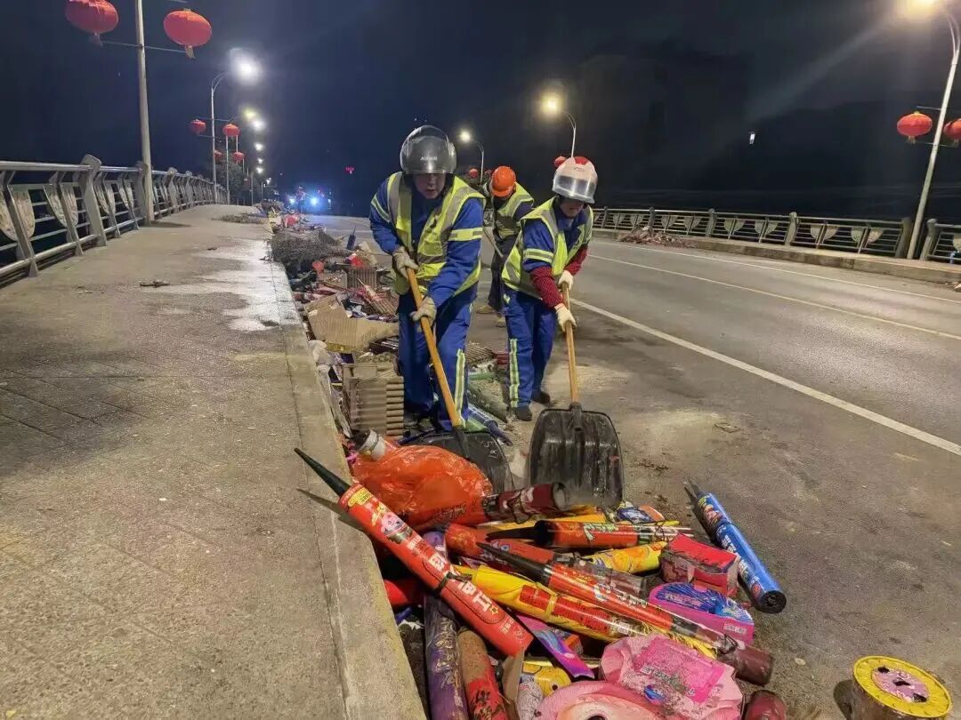燃放高峰期,机动保洁队伍定点值守、动态巡护,实现烟花残渣随产随清;深夜市民归家后,作业小组立即开展“地毯式”全域清扫,搭配专业清运车辆分片攻坚、连夜奋战。