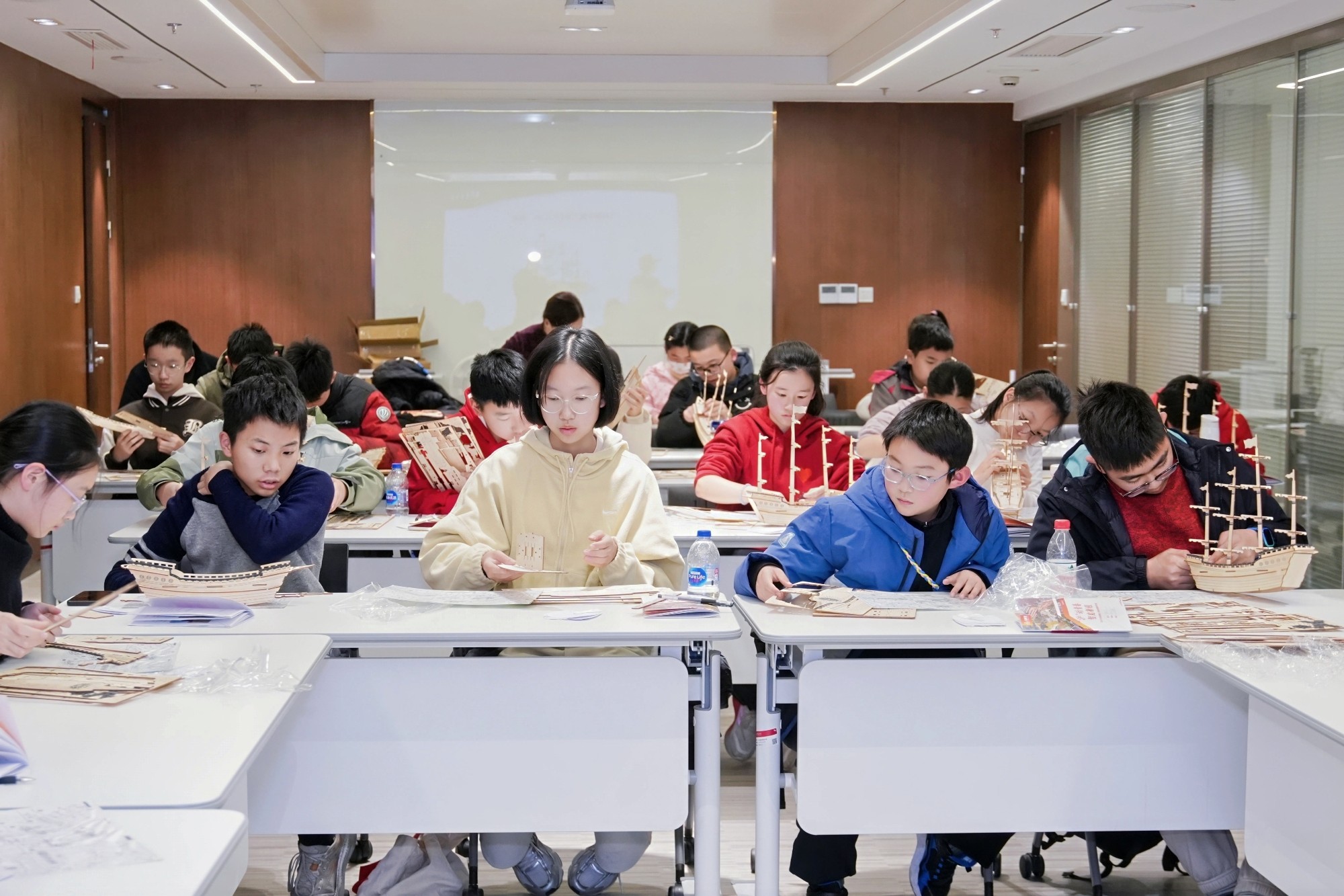 船舶知识实践课堂气氛活跃,老师以图文并茂的形式讲述了船舶的发展历程、功能演变以及我国现代船舶工业的辉煌成就。大家神情专注,眼中闪烁着对祖国强大科技实力的由衷自豪。手工制作环节,青少年们需要亲手将一块块木板拼搭成船舶模型,在实践操作中巩固所学。活动尾声,大家手持自己精心制作的船模在庙门前合影留念。一艘艘小小的船只,既承载着一天的研学收获,也寄托着大家对科技与海洋的无尽向往。