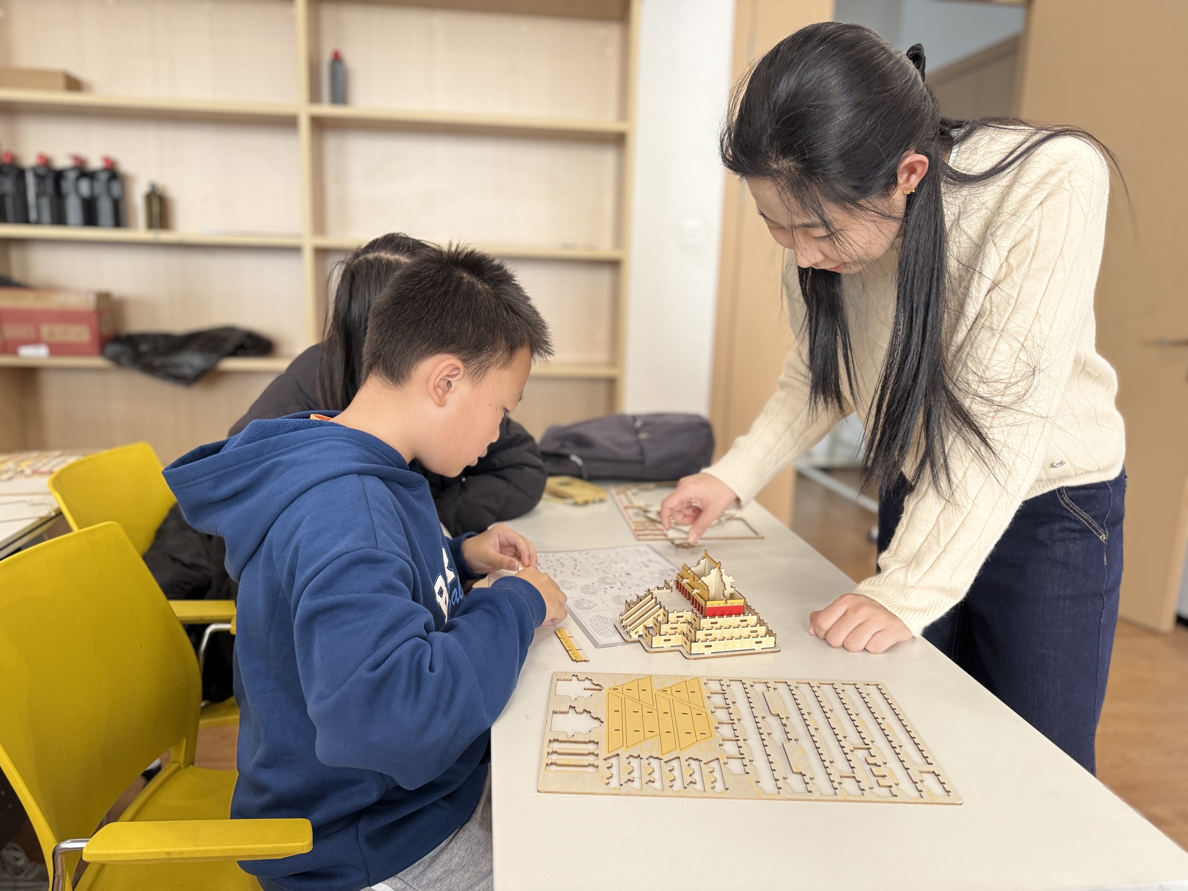 搭建环节一开始,现场便化作欢乐的创作天地。家长和孩子凑在一起,辨识榫卯构件,对齐拼接,配合默契。小朋友们化身“小小建筑师”,拿着木件反复比对角度;家长在旁或引导,或协助,一起商量着怎么才能拼得又正又稳。在一次次的尝试与调整中,一座座精致的“小太和殿”逐渐成形。“原来老祖宗的建筑智慧这么奇妙!看着孩子专注的样子,还主动和我分享榫卯知识,这次活动真有意义。”一位家长在活动结束后笑着说。