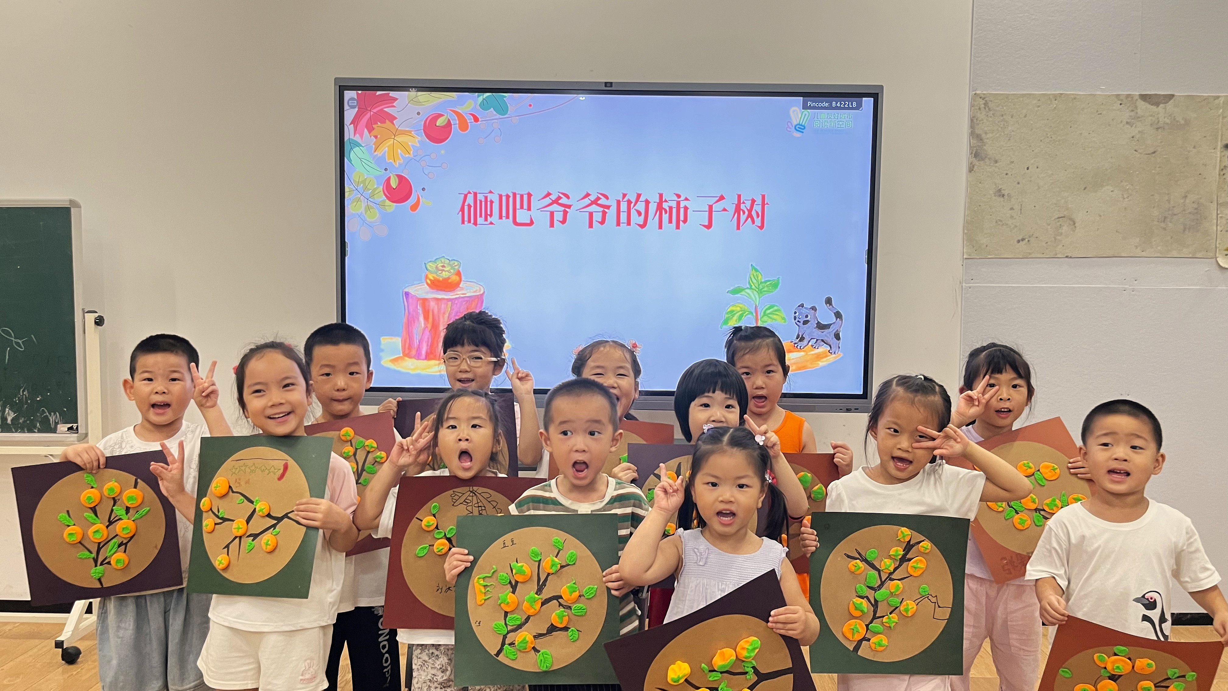 活动伊始,老师以富有感染力的语调展开绘本讲述,带领孩子们跟着“砸吧爷爷、哎呀奶奶” 的脚步,感受柿子树从抽芽到结果的四季流转,细腻的情节不仅勾起孩子们对植物生长的好奇心,更悄悄播下探索自然的种子。随后的科普课堂上,老师借助直观的趣味图解,将柿子树 “春发芽、夏开花、秋结果、冬休眠” 的生长规律清晰呈现,让抽象的自然知识变得触手可及;同时还深入科普“柿子通身是宝”的特性:果肉能制成香甜柿饼,柿蒂可入药调理,柿叶能炒制养生茶,更贴心提醒柿子与螃蟹、牛奶同食的饮食禁忌,让科普知识既实用又贴近生活。