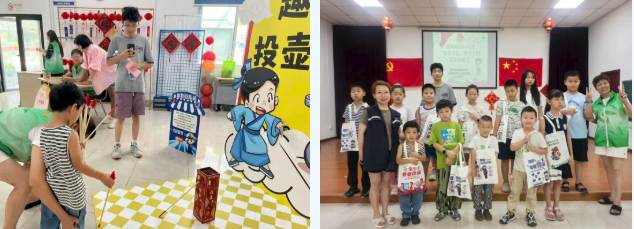 佳翔苑的 “社区小先生反诈园游会” 更成了孩子们的乐园。活动以 “集章赢奖” 为线索,孩子们领卡后就能参与各个项目:知识问答环节,“电信诈骗有哪些形式” 的问题刚出口,小手就举得老高,有的还站起来喊 “我知道!有刷单诈骗、冒充客服诈骗!”,尽显 “小先生” 风采;“反诈投壶” 的箭靶上标着 “刷单能赚钱”“中奖要先交押金” 等话术,套中后工作人员就细致讲解防范要点;“反诈沙包” 帮孩子们认清诈骗手段;再加上 “欢乐套圈圈” 的趣味项目,孩子们在笑声里玩得尽兴,更把反诈知识悄悄装进了脑海,成了会向家人传播的 “小小反诈宣传员”。