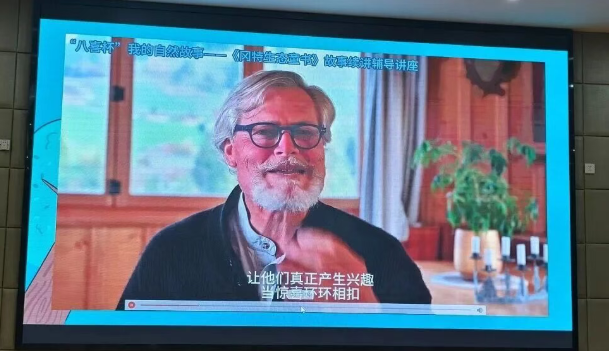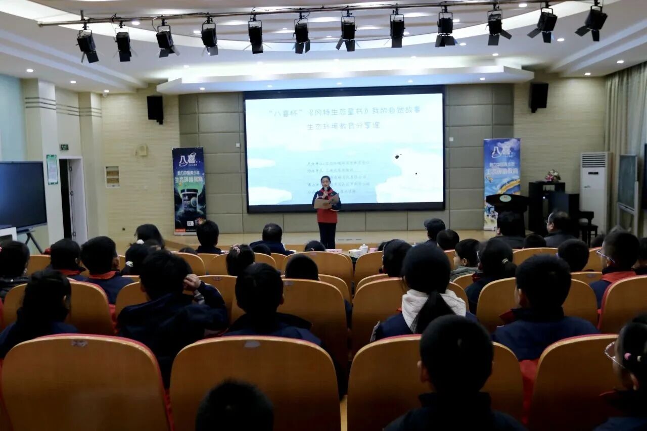 开讲核心课程活动现场还播放了《冈特生态童书》作者冈特·鲍利先生专程录制的辅导讲座视频,系统讲解生态童话的创作逻辑与环保内涵,为参与“八喜杯”故事续讲征集活动的学生提供指导。第二轮有奖问答紧扣视频内容,进一步巩固学习成果。