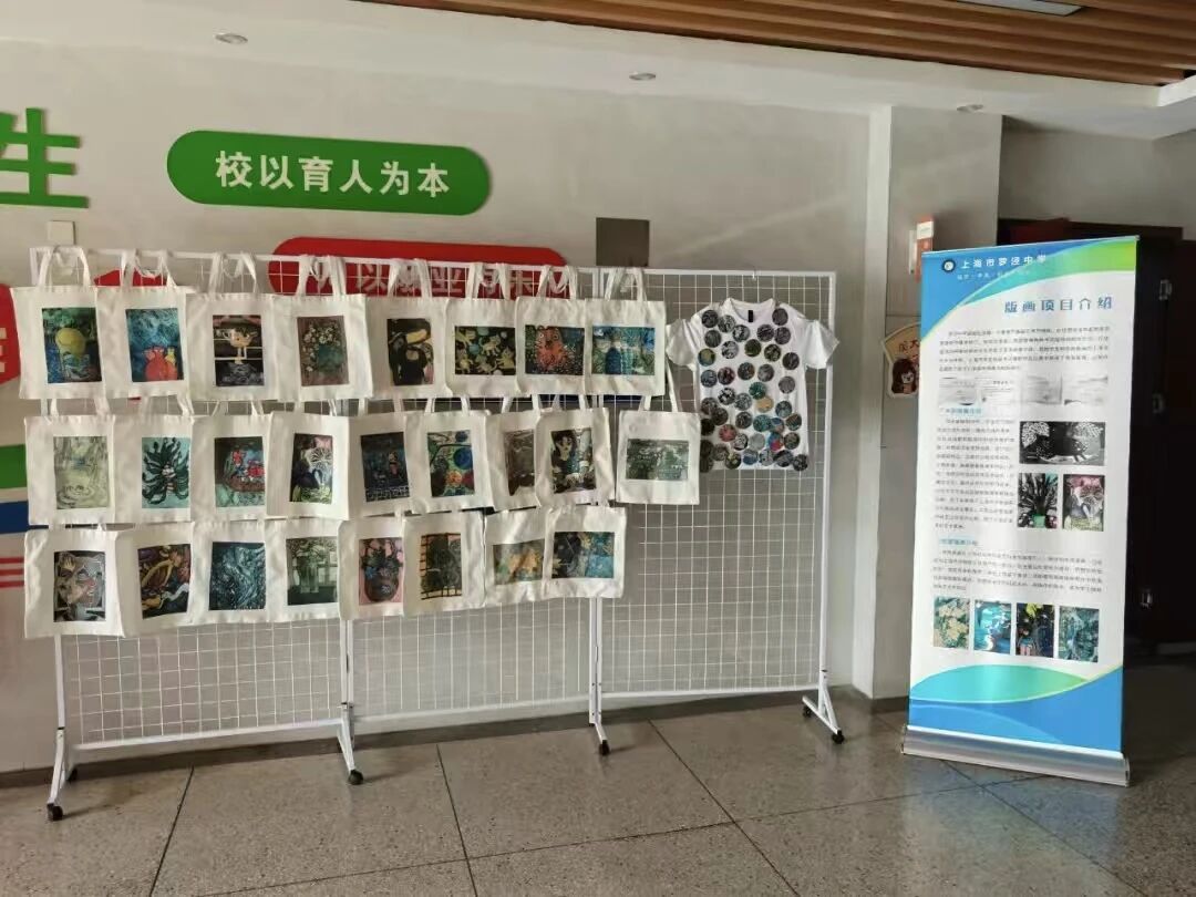 为展示创作成果,进一步营造校园艺术氛围,学校学生发展中心与三位美术教师共同策划了版画艺术成果展。师生共同协作,将优秀的版画作品精心装裱,并巧妙布置于校园展示区。展览现场,学生们将版画创意与现代生活紧密结合,将图案印制在T恤、帆布包及徽章之上。这些色彩鲜明、构图精巧的文创作品一经展出,便吸引了众多师生驻足观赏,成为了校园里一道流动的文化风景线。