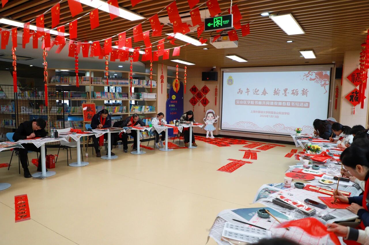 近日,上海外国语大学附属宝山双语学校北极星图书馆内红意盎然、墨香四溢。在一片温馨喜庆的新春氛围中,书法共同体教师迎来了一场别开生面的研修活动——既是教学智慧的交流,更是一场以笔墨迎接丙午新春的暖意笔会。