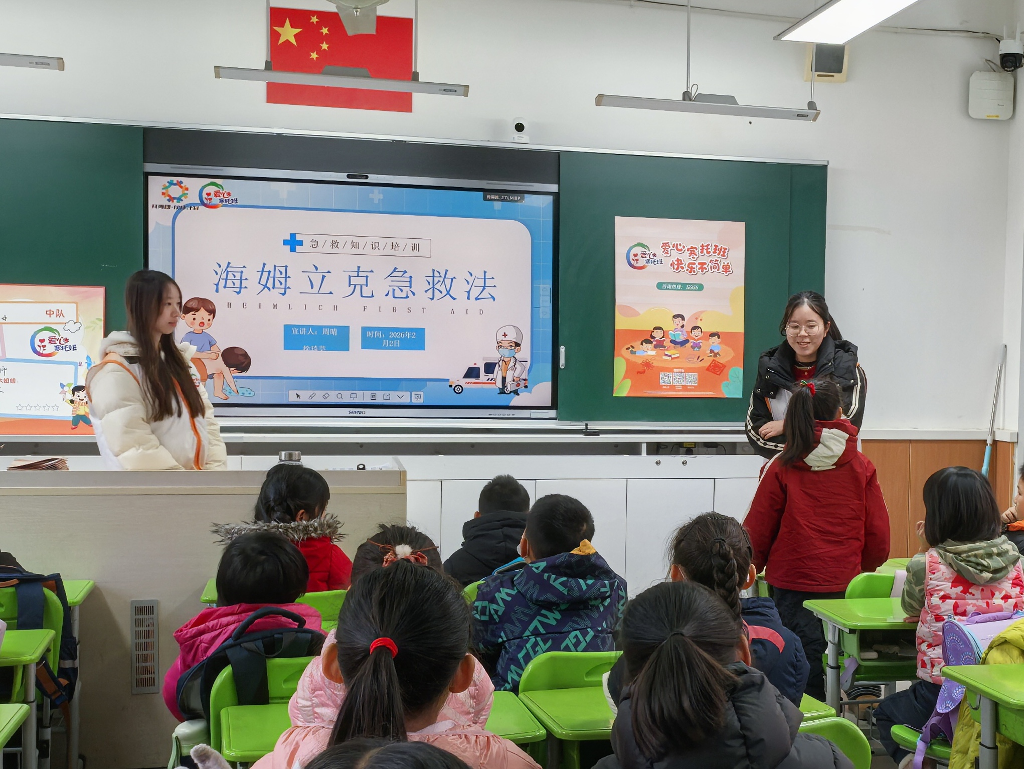 开班第一课以《我与祖国共成长:一起走进“十五五”规划》为主题,老师以生动易懂的方式,为孩子们描绘国家发展的宏伟蓝图,在他们心中播下关注时代、立志未来的种子。  随后,一堂实用而有趣的《海姆立克急救法》课程接续开展。通过互动讲解与情景模拟,孩子们学会了异物卡喉时的自救与互救方法。在“剪刀、石头、布”的口诀声中,小小学员们认真练习,掌握了守护自己与他人的重要技能。