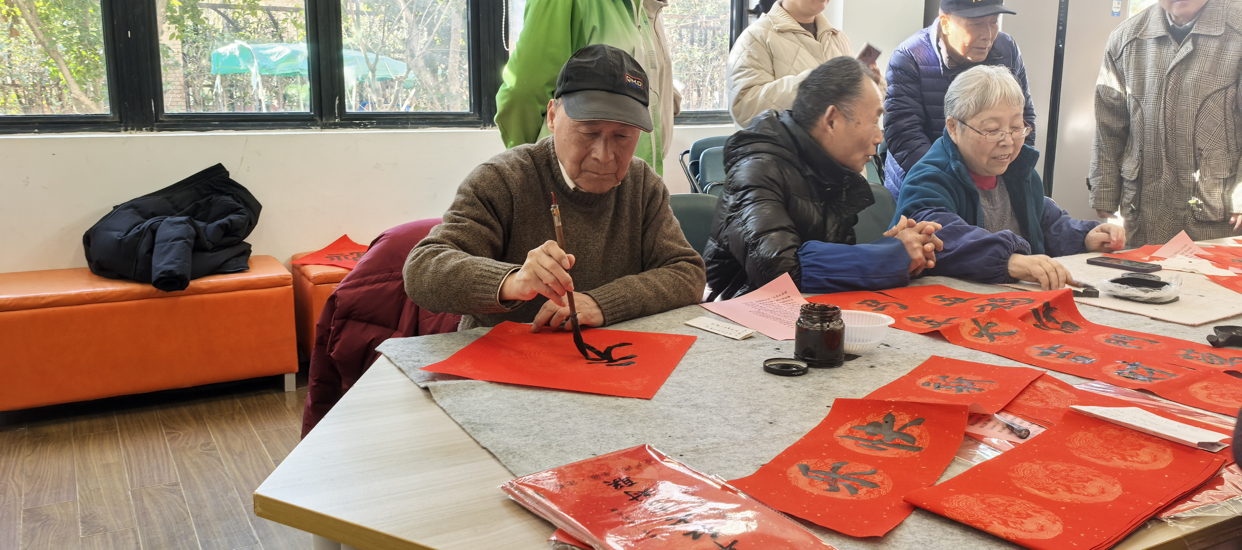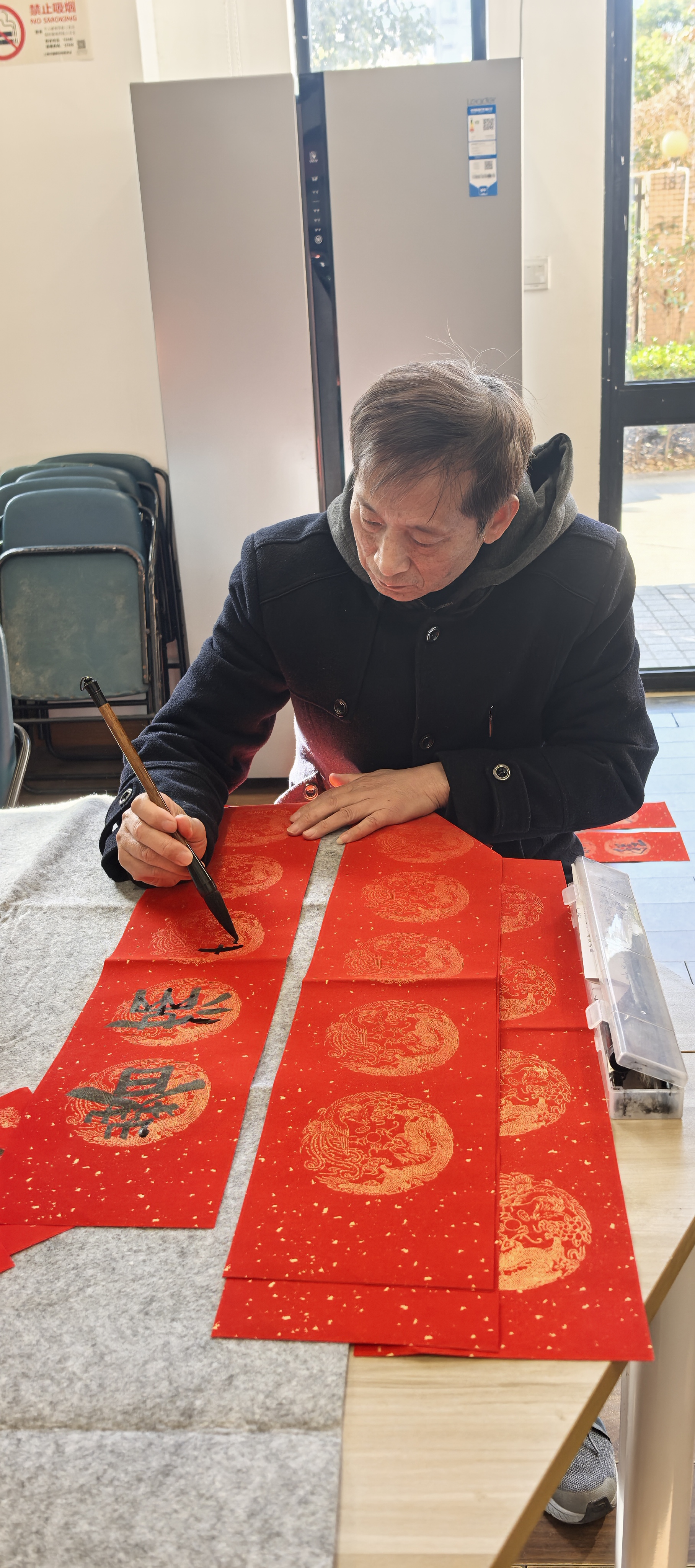 活动现场,红纸铺展、墨香四溢。书画班的成员们率先挥毫,笔走龙蛇间,一副副寓意吉祥的春联跃然纸上:“天增岁月人增寿,春满乾坤福满门”“福旺财旺运气旺,家兴人兴事业兴”……苍劲有力的字体引得居民们阵阵赞叹。