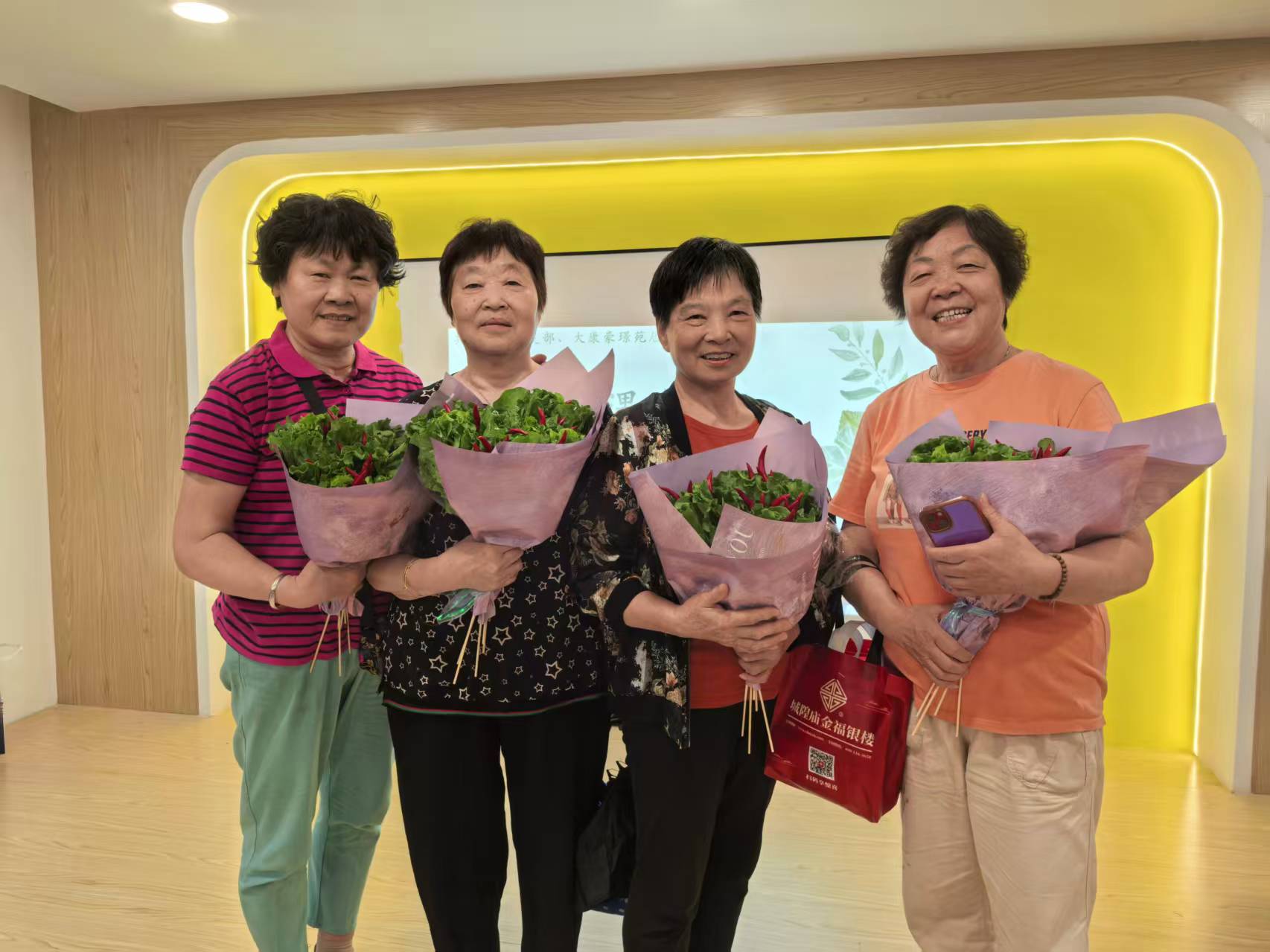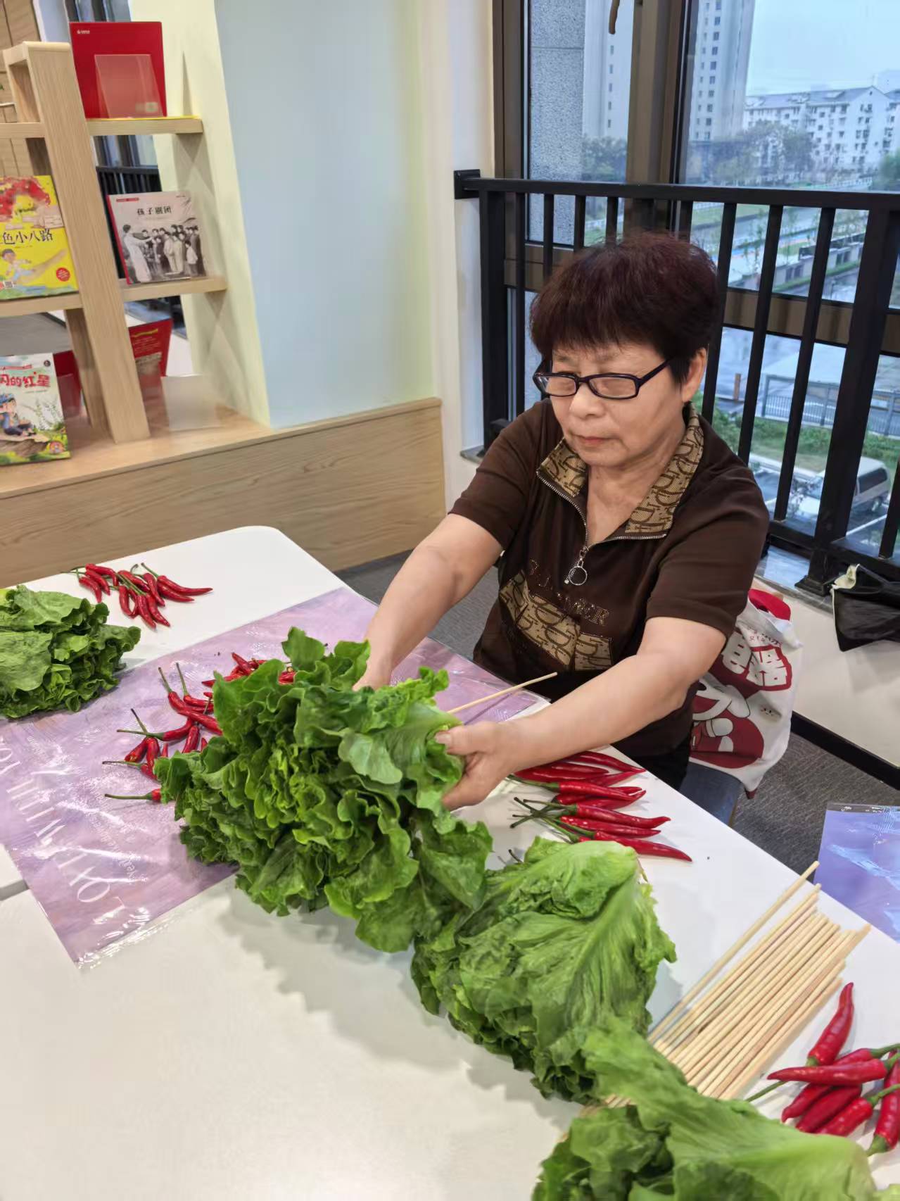 活动现场,大家在老师的指导下将生菜和小米辣巧妙地固定在竹签上,并用花艺纸和丝带精心包装,制作出了一束束色彩鲜艳、形态各异的蔬菜花。这些花束作品不仅展现了大家的巧手匠心,还蕴含了对所有人的美好祝愿,希望大家的生活也能如这些花束般红红火火、生意盎然。