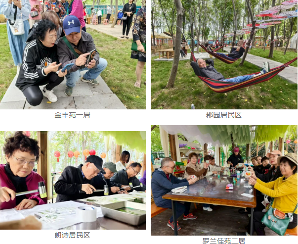 锦绣风光·乐游园 在这秋高气爽的时节,各居民区纷纷组织社区中老年居民们共赴远景村参加游园会活动,在欢声笑语中感受乡村振兴的丰硕成果,于美丽乡村间共度重阳敬老时光。走进远景村,一幅生态宜居的乡村画卷徐徐展开:清澈的小河绕村而过,岸边的垂柳随风摇曳。老人们一边欣赏美景,一边拍照留念,在大自然中“返老还童”,享受美好秋日。“老伙计们”分组依次体验打卡游园会的各个项目:在林间吊床上小憩片刻,近距离接触大自然;亲手体验丝巾拓印、手工肥皂等DIY制品;手写美好心愿祈福;琴房中感受优美音乐流转,陶冶情操;趣味投壶套圈一展敏捷身手,赢取惊喜好礼……在欢声笑语中度过充实而丰富的一天。