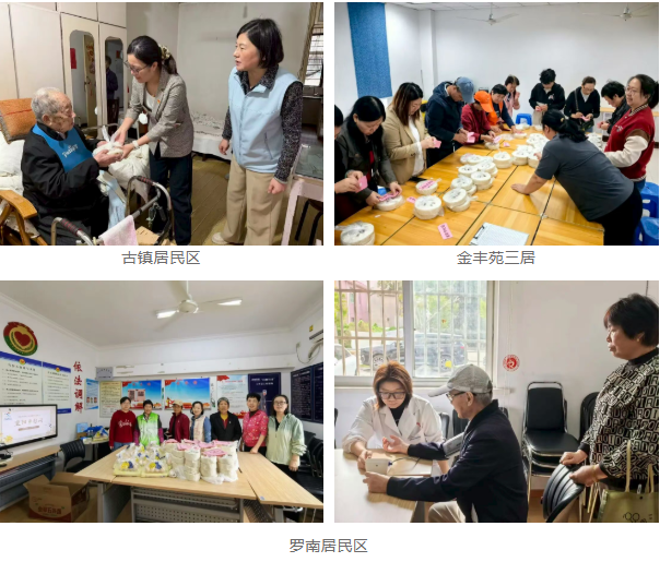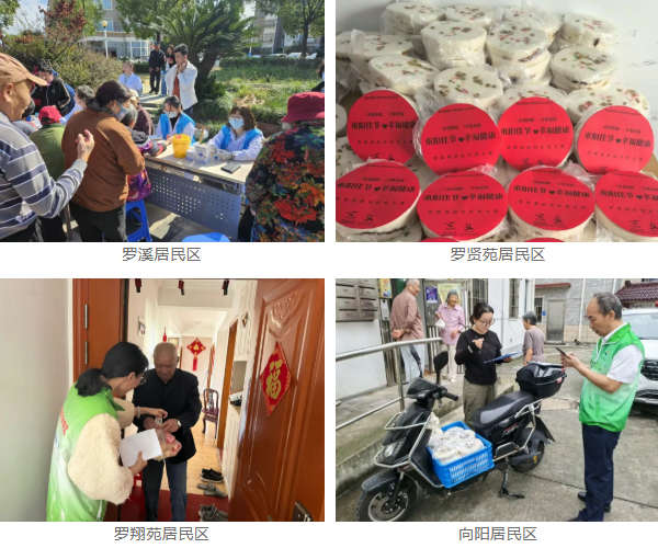 重阳之际,各居民区积极组织社工、志愿者及党员开展重阳节慰问老人活动。居委工作人员和志愿者们组成慰问小组,带着营养丰富的鸡蛋和长寿面、重阳糕等精心准备的慰问品,深入小区内的高龄老人和独居老人家中,与老人们亲切交谈,询问老人的身体状况和生活情况,耐心倾听他们的故事和需求,并叮嘱他们要注意保重身体,有困难随时向居委反映。通过面对面的交流,及时跟进高龄老人平日生活情况,切实帮助其解决困难。罗溪、罗南居民区还邀请了罗店医院、罗南社区卫生服务中心的医护人员开展爱心义诊服务,为老人免费测量血压、血糖,并针对每位老人的不同情况,在生活方式、饮食习惯、合理用药等方面给予专业的健康指导。