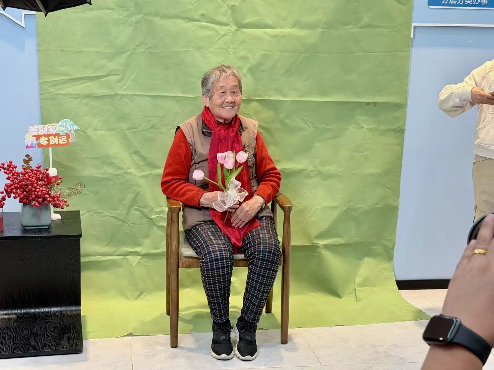 中心精心布置的摄影棚内,老人坐主,绿布作衬。一旁的小桌子上摆放着梳子、围巾、头纱、手捧花、墨镜等小道具,为老人们增添节日的仪式感与新潮摄影的时尚气息。