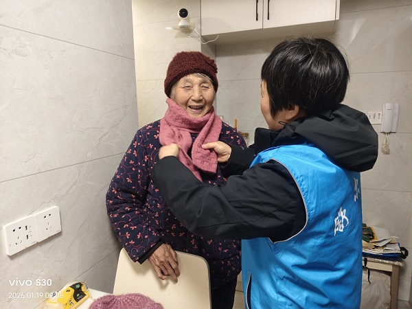 “奶奶,天儿冷了,这条围巾送给您,不仅戴着暖和,也是咱们社区大家庭的心意!”近日,在上海市老年基金会宝山代表处的大力支持下友谊路街道“银发老友记”项目的志愿者们带着一批特殊的冬日礼物走进社区、养老院,将一条条色彩鲜艳、质地柔软的手织围巾、帽子送到高龄老人和平安志愿者手中,用实际行动驱散冬日寒意,传递社区对老年群体和志愿者的牵挂与关爱。