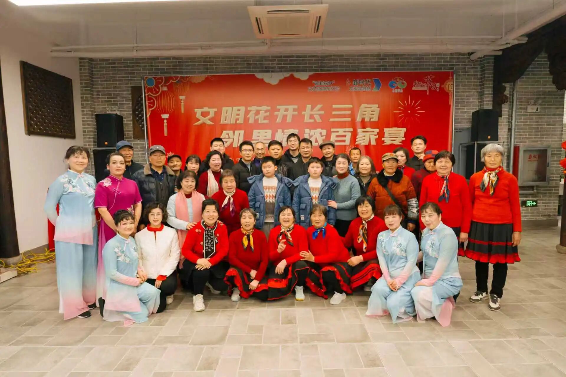 正月十四中午,江苏省太仓市浏河镇“七十二家理想村”龙太极党群服务站内张灯结彩、笑语欢声,睽违三年的“沪苏毗邻百家宴”热闹开席。来自上海市宝山区罗泾镇洋桥村与江苏省太仓市浏河镇浏南村的党员群众们,各自端出本村的特色好菜,围坐在一起共庆佳节、共品家宴、共叙乡情。这场跨越行政边界的团圆饭,让一河之隔的两地村民真正“走到一起”,用最朴素也最真诚的方式,续写了沪苏毗邻一家亲的暖心故事。