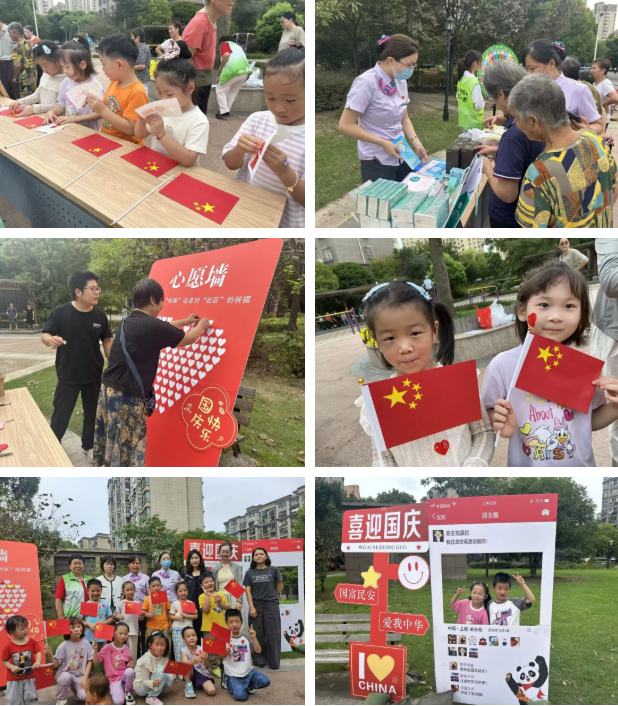 亲子打卡,定格家国情怀 	在美安苑新时代文明实践站,“邻里共庆华诞 打卡家国美好”主题活动充满了童真与爱国温情。孩子们在老师、志愿者和社区居民的陪伴下,兴致勃勃地动手制作一面面鲜艳的五星红旗。随后,大家手持自制的红旗,在“美安苑欢度国庆”的特色背景板前快乐合影。一张张灿烂的笑脸与一抹抹鲜艳的“中国红”交相辉映,共同定格了对于祖国最纯真、最热烈的热爱与自豪。