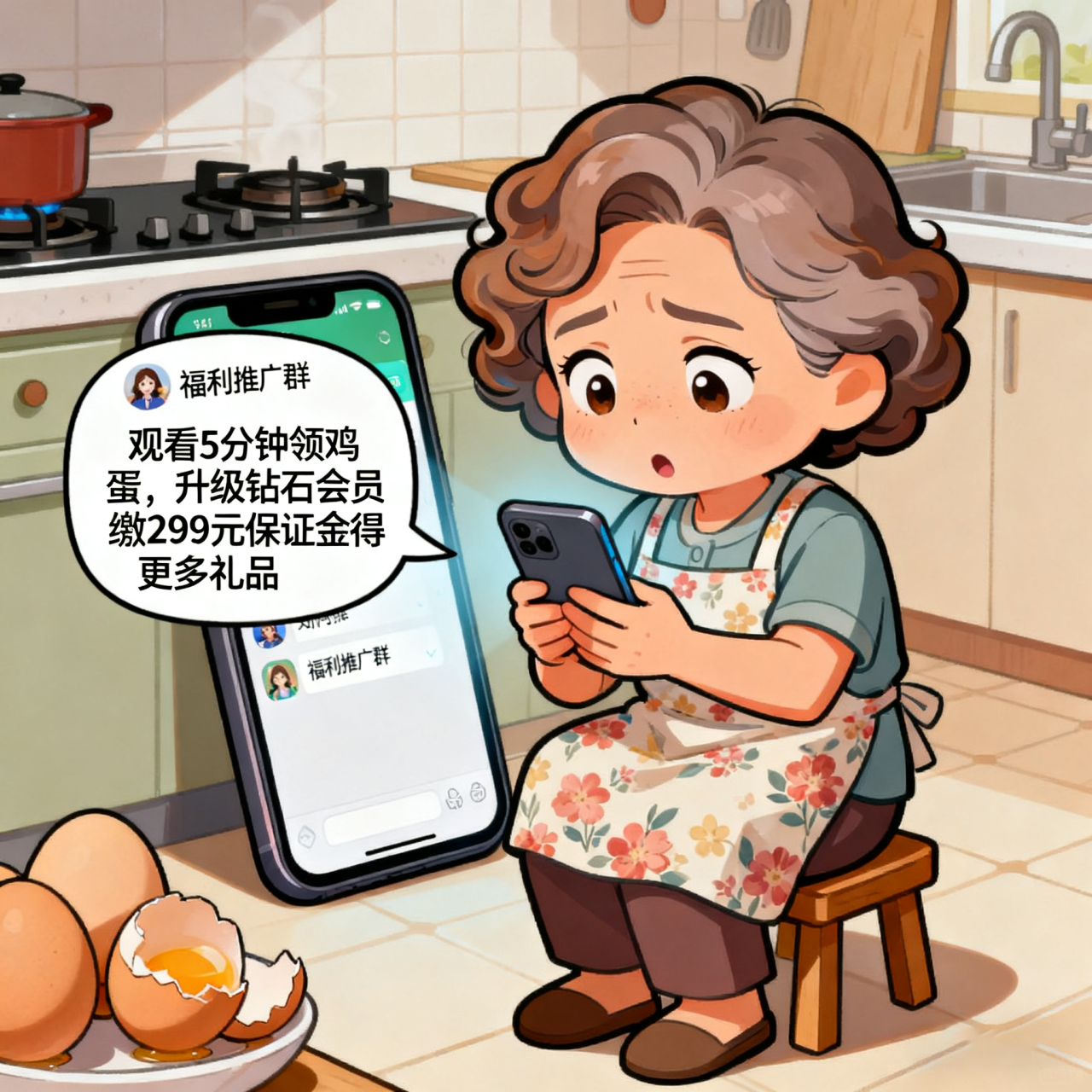 案例三:直播间免费礼品骗局 隔壁街镇的刘阿姨被拉入一个“福利推广群”,群主声称在某直播平台观看5分钟即可领取免费鸡蛋。刘阿姨按要求完成操作后,对方又以“升级钻石会员可领取更多礼品”为由,要求其缴纳299元保证金。就在刘阿姨准备转账时,女儿回家发现异常,立即制止并报警。经查,该群系诈骗团伙组建,已有多名老年人上当受骗。