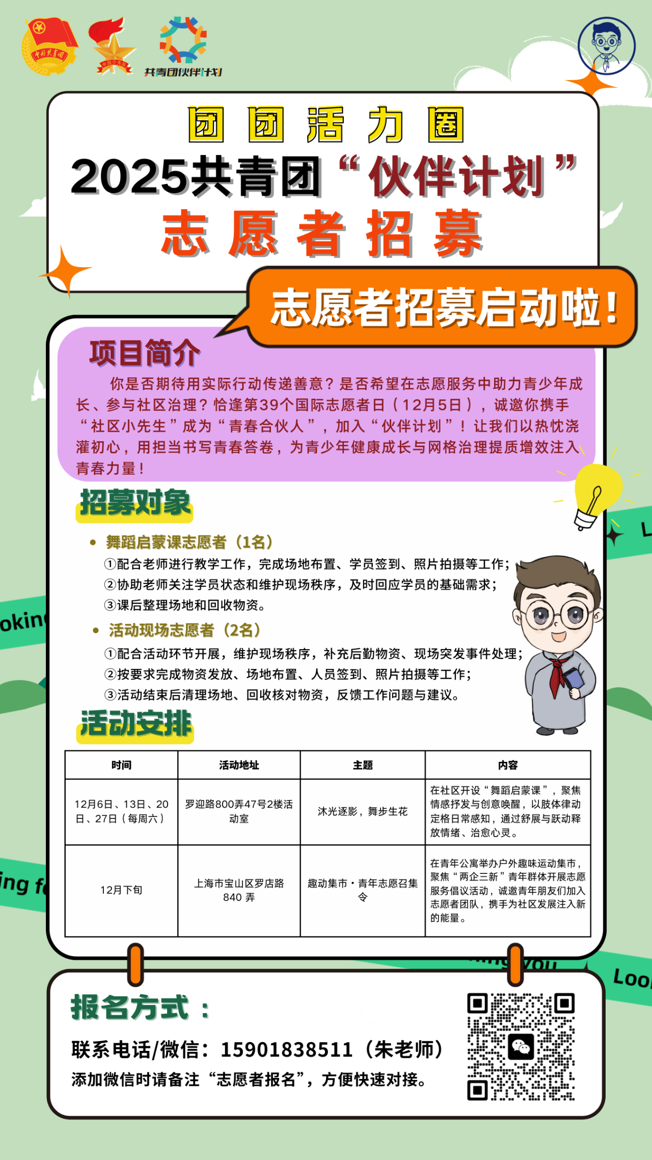 值此第39个国际志愿者日到来之际,2025共青团“伙伴计划”志愿者招募已正式启动!这是一场聚焦青少年成长、链接社区治理的公益行动,现诚邀你携手“社区小先生”成为“青春合伙人”,加入“伙伴计划”!用行动书写志愿答卷~ 一活动内容: ①沐光逐影,舞步生在花 社区开设“舞蹈启蒙课”,聚焦情感抒发与创意唤醒,以肢体律动定格日常感知,通过舒展与跃动释放情绪、治愈心灵。 ②趣动集市・青年志愿召集令 在青年公寓举办户外趣味运动集市,聚焦“两企三新”青年群体开展志愿服务倡议活动,诚邀青年朋友们加入志愿者团队,携手为社区发展注入新的能量。 二我们能提供: 专属岗前培训与专业指导:内容涵盖青少年沟通服务技巧、社区治理基础认知、志愿服务规范流程等,助力快速上手岗位工作; 官方认证与荣誉激励:提供正规志愿服务时长记录与证书,表现突出者将授予年度“优秀青春合伙人”荣誉称号及表彰; 完善的服务保障:活动期间提供饮用水、免费午餐,统一购买志愿服务保险,解决参与后顾之忧。 三任职要求: 1.年满18周岁,具备良好的沟通协调能力与团队合作精神;2.关注青少年成长,对社区治理有一定兴趣;3.热心公益事业,有相关活动组织经验者优先。 四报名方式: 咨询&报名方式:联系电话/微信:15901838511(朱老师),添加微信时请备注“志愿者报名”,方便快速对接。 招募详情看这里  青春逢盛世,奋斗正当时! 让我们以青春之名, 赴时代之约,成为“青春合伙人”, 用爱心温暖社区,用行动助力成长, 共同描绘 社区治理与青少年成长的美好蓝图! 期待你的加入! |