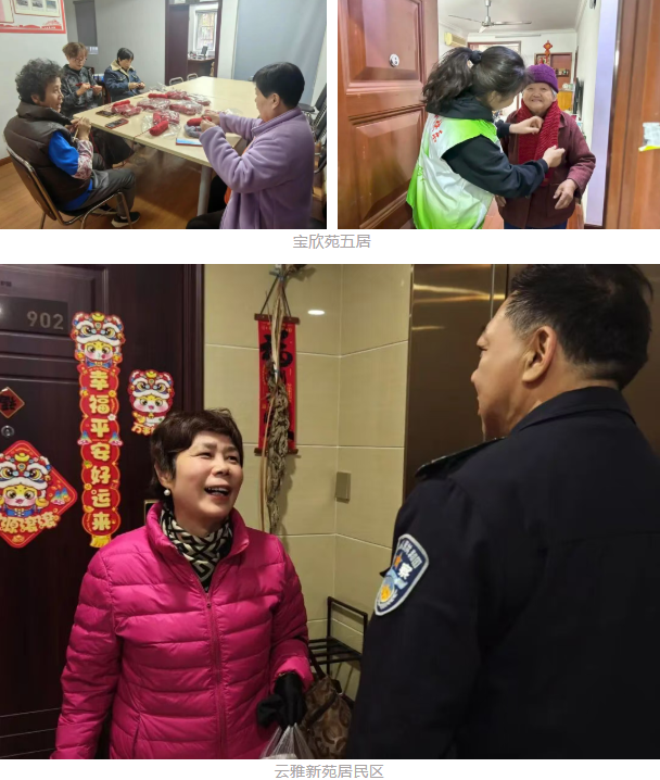 巧手编织送温情 为弘扬中华民族敬老爱老传统美德,宝欣苑五居党支部组织志愿者开展“暖心编织·情暖夕阳”公益活动,为独居老人、高龄老人送上亲手编织的爱心围巾,用一针一线串联起邻里温情。活动前期就有不少心灵手巧的社区居民、党员积极响应招募,主动加入编织队伍。志愿者们利用闲暇时间,用娴熟的编织技艺织起了一条条配色温馨、针脚细密的围巾。社区工作人员与志愿者分组上门,将饱含心意的围巾逐一送到老人手中,并贴心地为老人围上。云雅新苑支部则聚焦独居老人需求,开展“警民连心上门访”服务。社区民警与居委工作人员一起敲开独居老人家门,细致排查居家安全隐患、讲解反诈知识,更坐下来倾听老人生活琐事。老人举着手机与民警开怀互动,笑意里满是对这份关怀的真切认可。