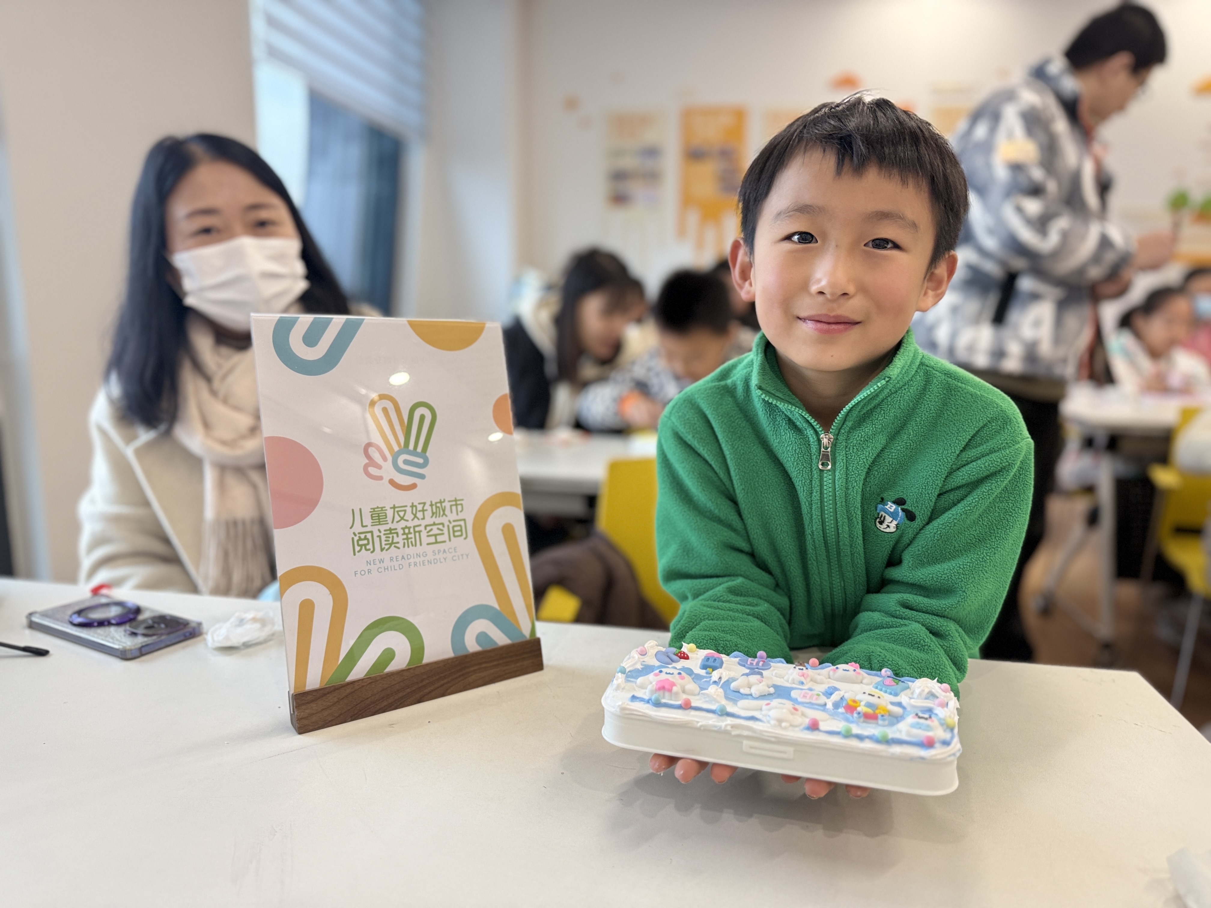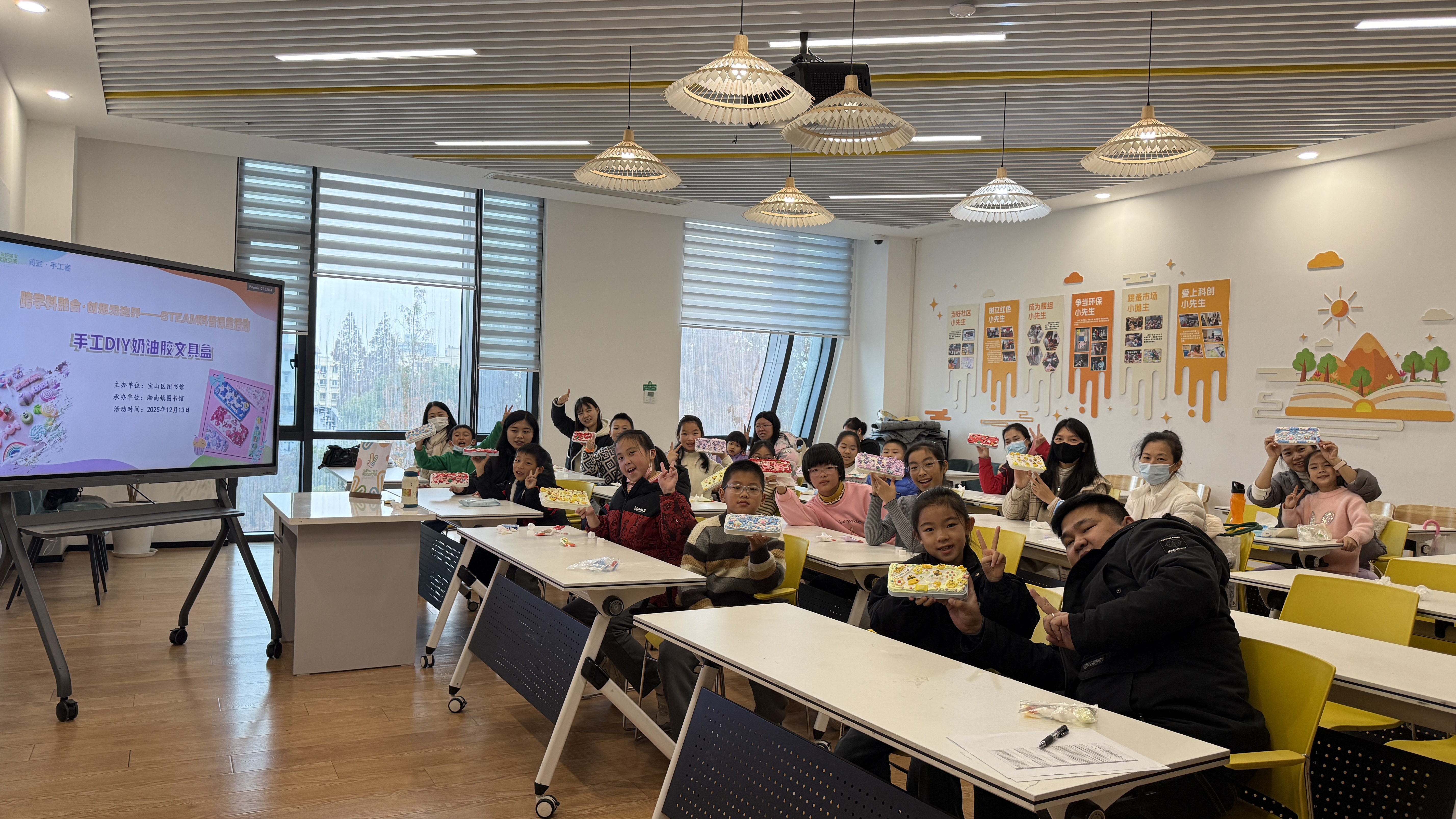 近日,宝山区图书馆为淞南镇图书馆儿童友好阅读新空间带来了一场妙趣横生的“阅宝・手工客——手工DIY奶油胶文具盒”活动。13组亲子家庭齐聚一堂,用色彩与创意共度了一段欢乐的课外时光。