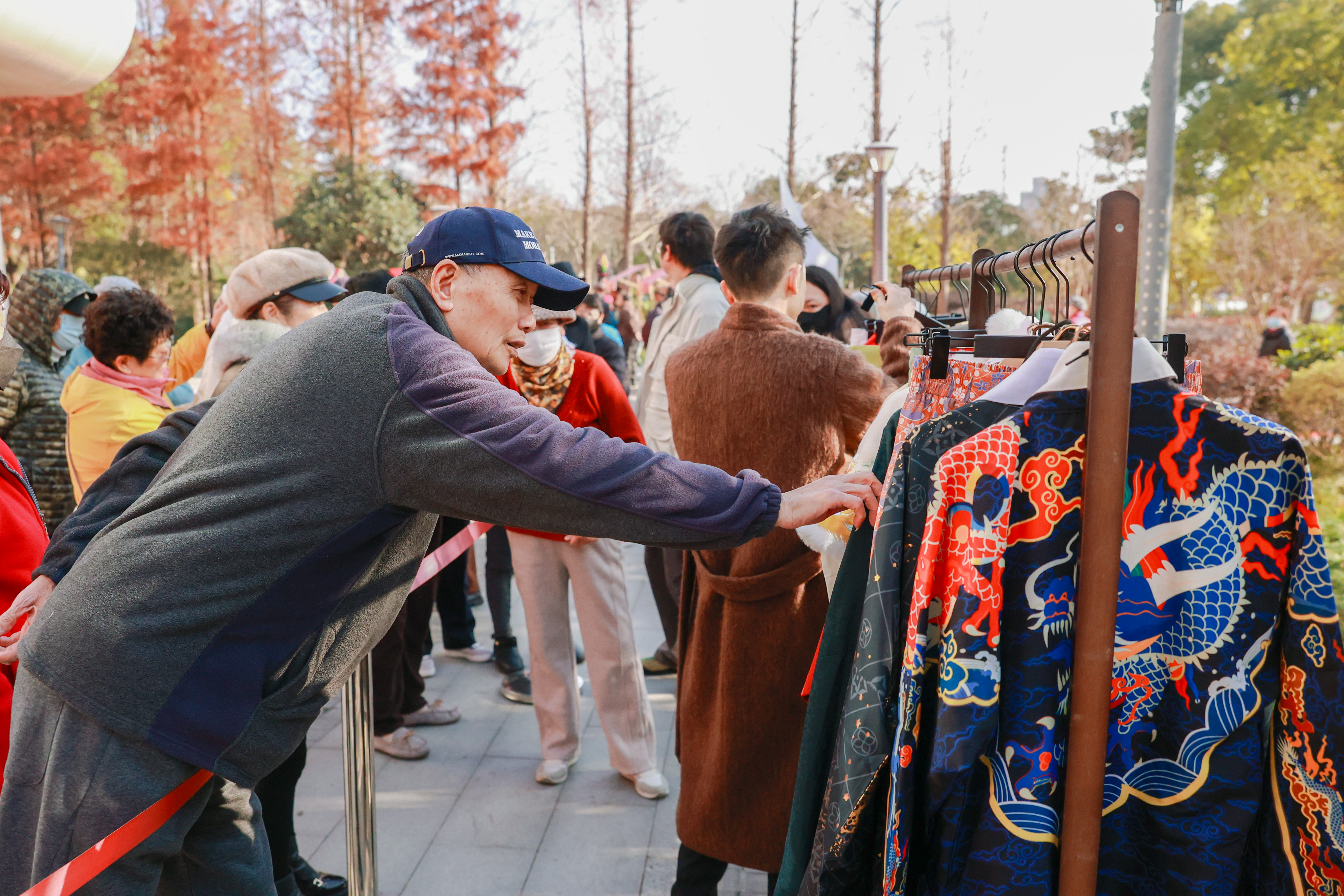 为了让居民们更深入地感受国潮文化的魅力,活动特别设置了“汉服换装体验”区,“旦愿同裳”是其中最热门的区域。挑选衣服、等候换装的队伍始终热情不减,不少家庭全家出动,换上整套汉服后在特设的打卡区合影,笑声不断。现场的叔叔阿姨们也难得体验了一把“古装戏”,换上汉服的他们穿梭在集市与舞台之间,与国风表演和非遗摊位合影留念,沉浸式地体验了一把“穿越”之旅,欢声笑语中洋溢着对传统文化的喜爱。