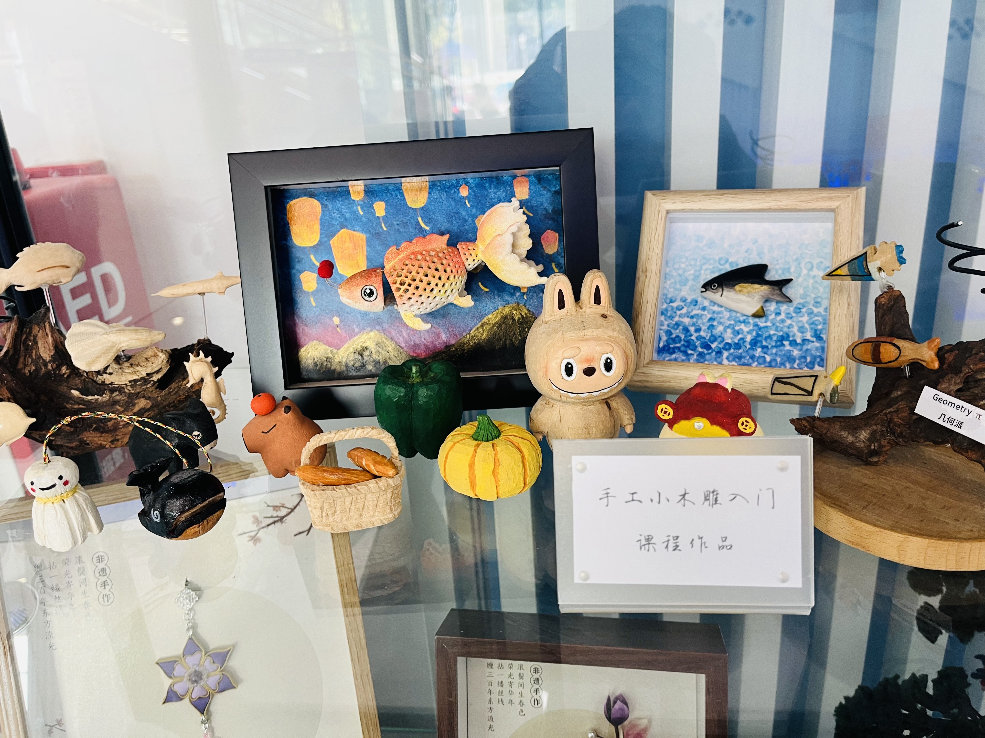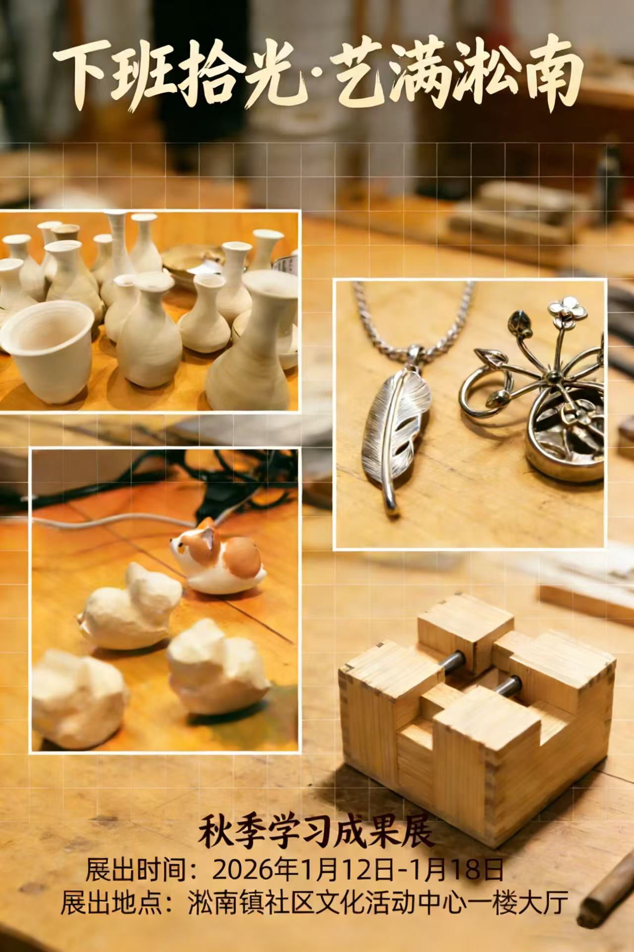 本次展览汇集了2025年夜校秋季班全体学员的优秀结业作品,涵盖多元手工艺术门类:现代陶艺体验课的瓷盘、摆件等陶器作品,复古手工银饰制作课的精致吊坠、手链,以及手工小木雕入门课的匠心小木雕,每一件作品都凝聚着学员的专注与创意。