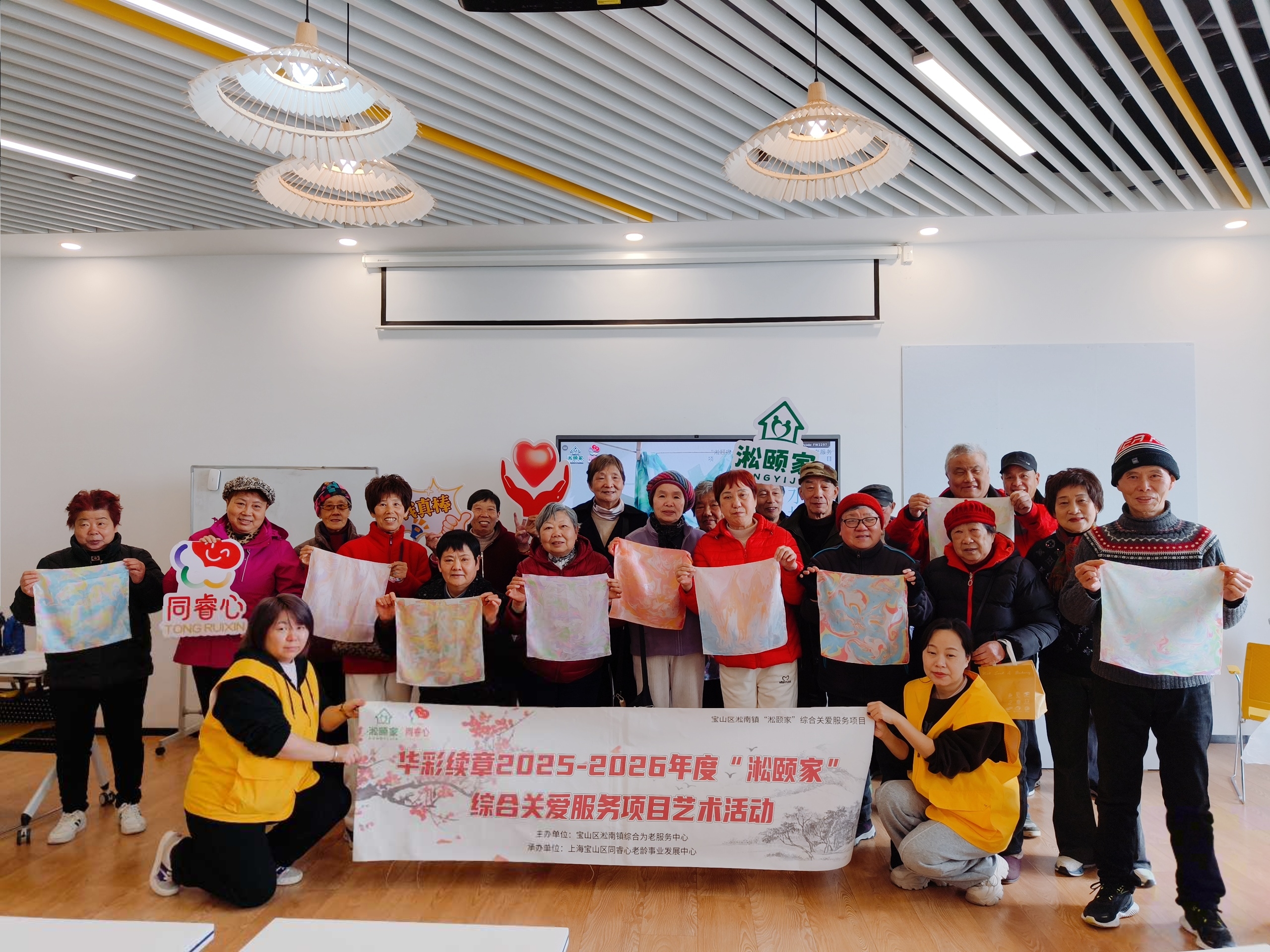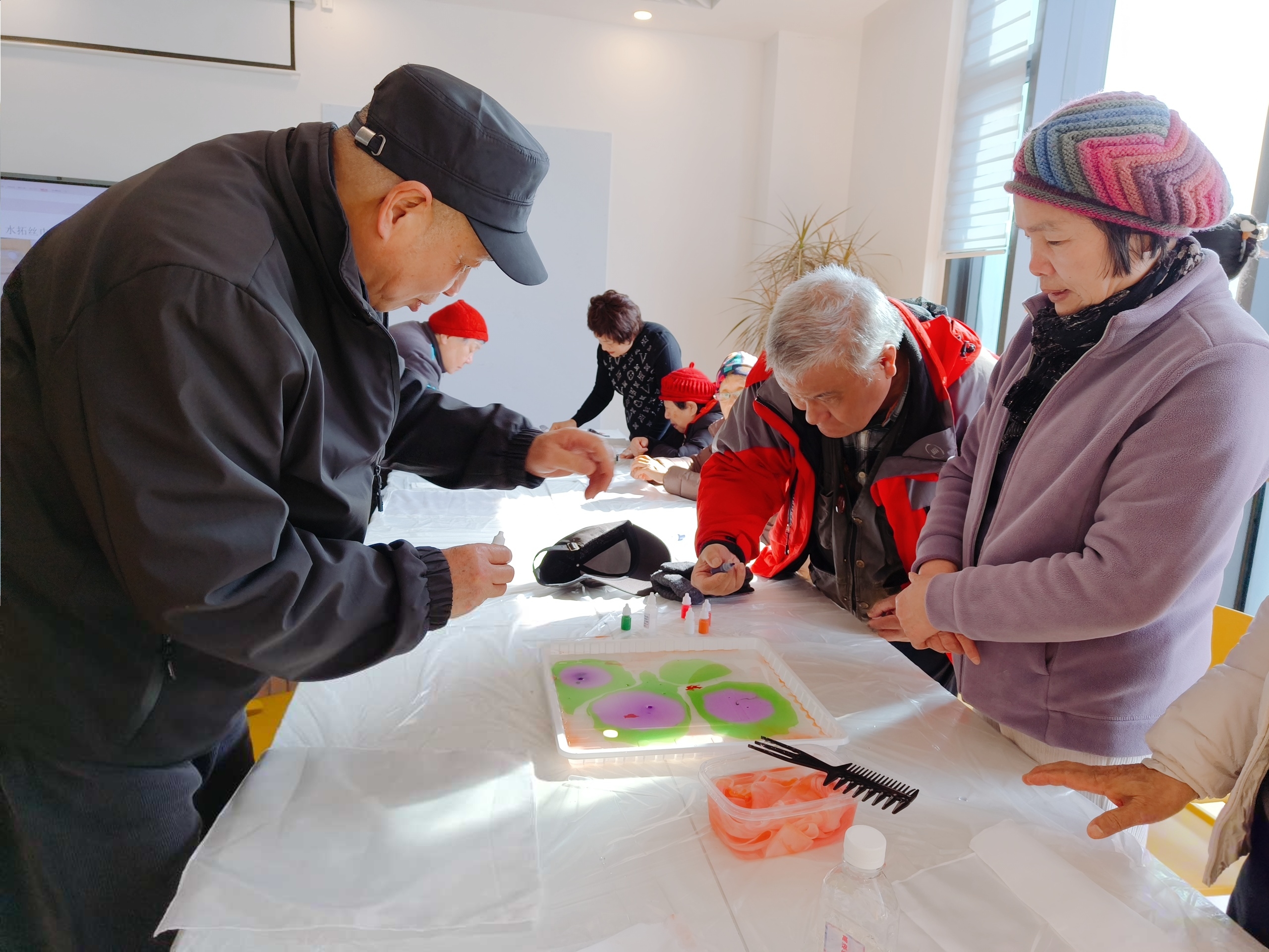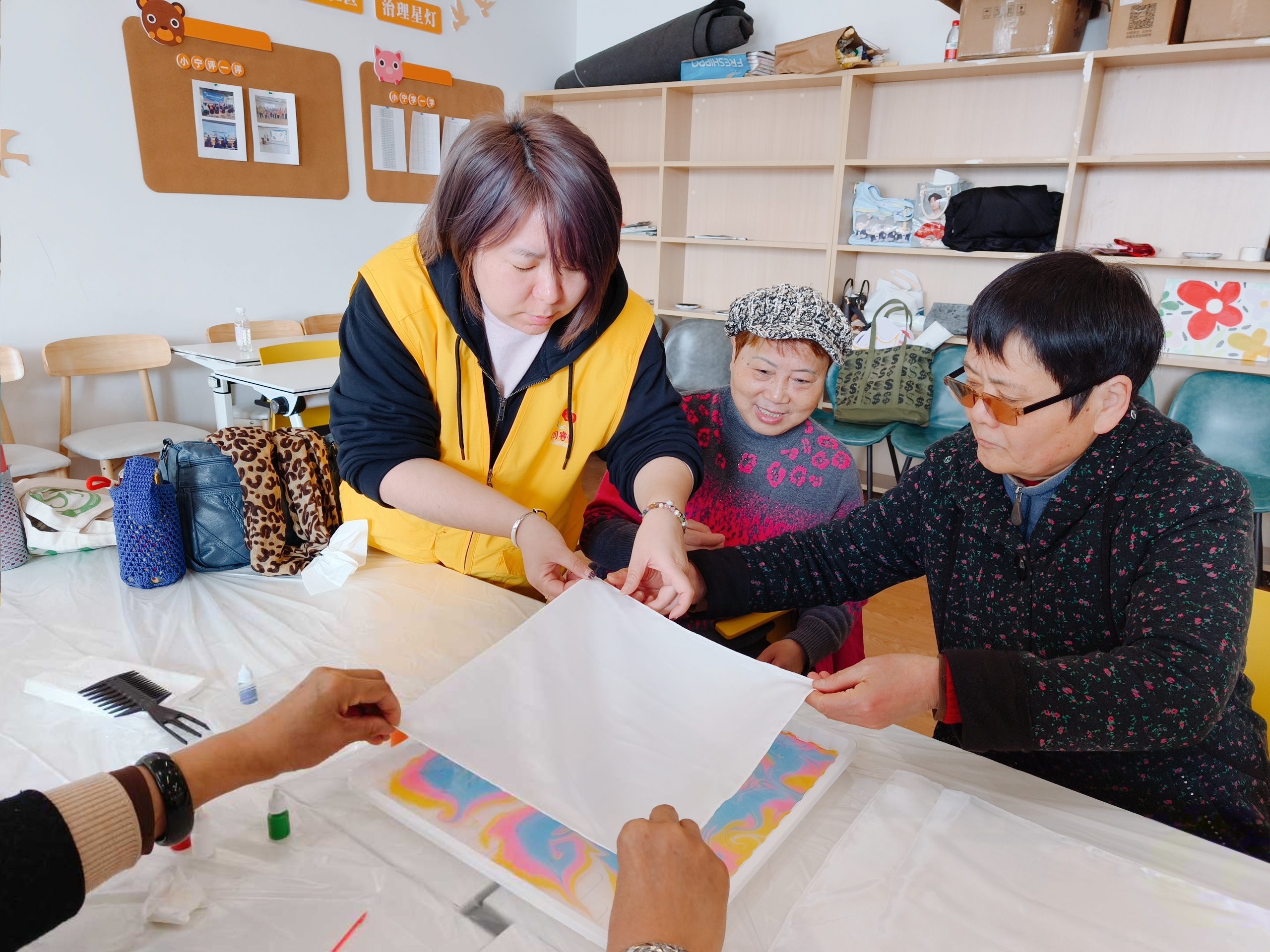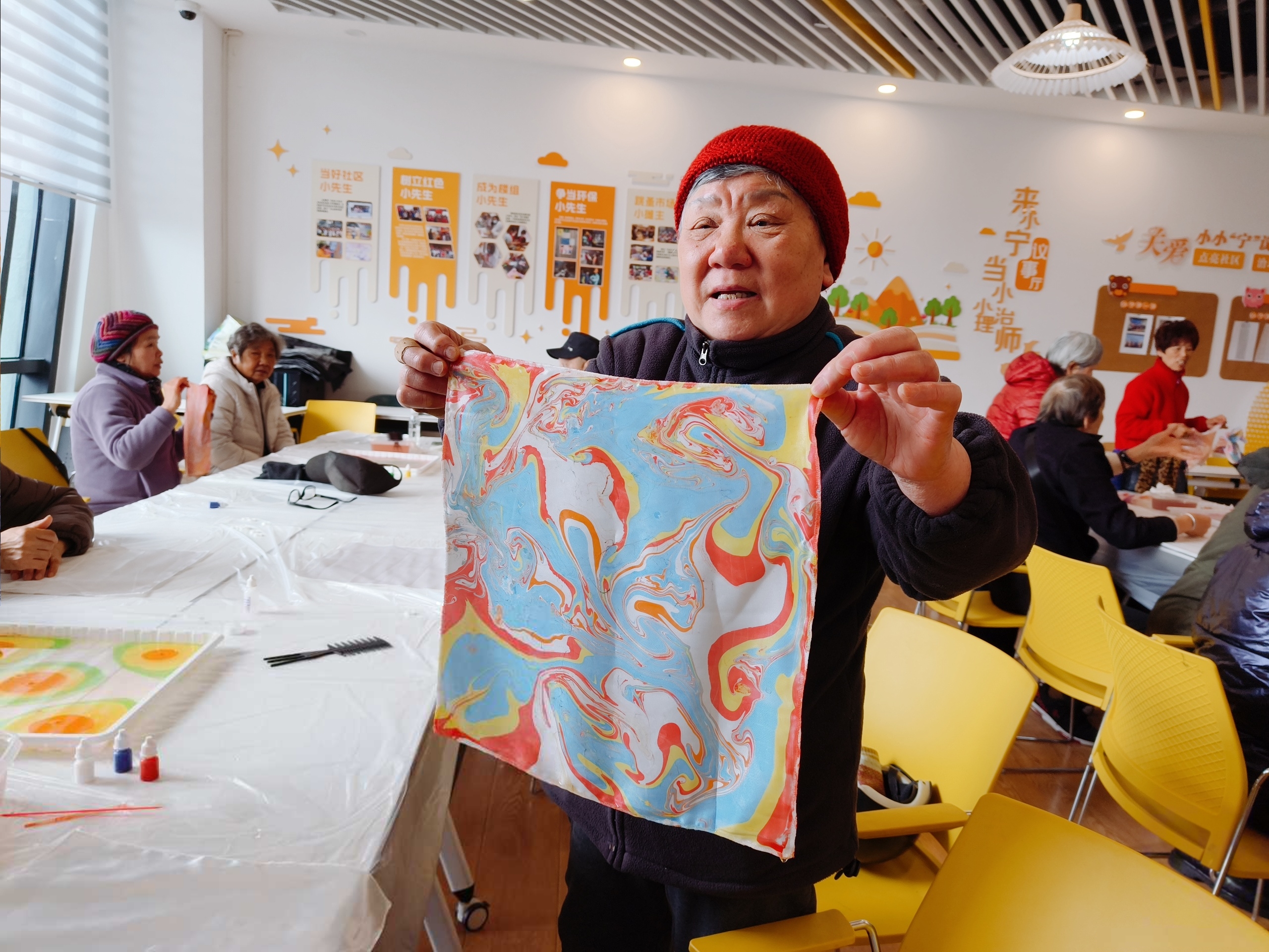 谁说晚年不能五彩斑斓?3月6日上午,淞南镇依托“淞颐家”综合关爱服务项目,组织开展了一场水拓丝巾体验活动,让老人在动手实践中感受非遗魅力,收获一份别样的文化关怀。  活动现场,老师详细讲解丝巾拓印的步骤,介绍颜料和工具的正确使用方法,并分享操作小技巧。在志愿者的陪伴下,老人们亲手体验了拥有千年历史的非遗水拓技艺。面对流动的色彩,大家从最初的拘谨逐渐变得好奇与欣喜。在老师示范和志愿者“一对一”辅助下,老人们大胆尝试色彩搭配,将白色丝巾轻轻覆于水面,滴一滴、划一划、印一印——原本素白的丝巾,转眼间便被染上独一无二的流动纹样。  重要的不是做丝巾,而是有人陪着一起做。此次活动不仅注重文化体验,更关注情感慰藉。现场采用“老搭档”互助模式,鼓励老人在协作中交流、在互助中分享,欢声笑语不断。两位性格内向的阿姨,因共用一盘颜料,聊起了年轻时最爱的衣裳颜色。看着自己亲手制作的丝巾,嘉骏香山苑的杨阿姨高兴地说:“没想到我也能做出这么漂亮的丝巾,有人陪我说说话、做做手工,特别开心。”  一条丝巾,一份温情。本次活动不仅让老人近距离感受非遗魅力,也通过沉浸式社交互动,有效缓解了他们的孤独感。愿这条亲手制作的丝巾,为他们的晚年增添一抹亮色。下一步,淞南镇将持续深化“淞颐家”品牌内涵,推出更多贴合老年群体需求的文化活动,努力建设“让居民笑容更灿烂、心里更温暖、生活有盼头”的幸福淞南。