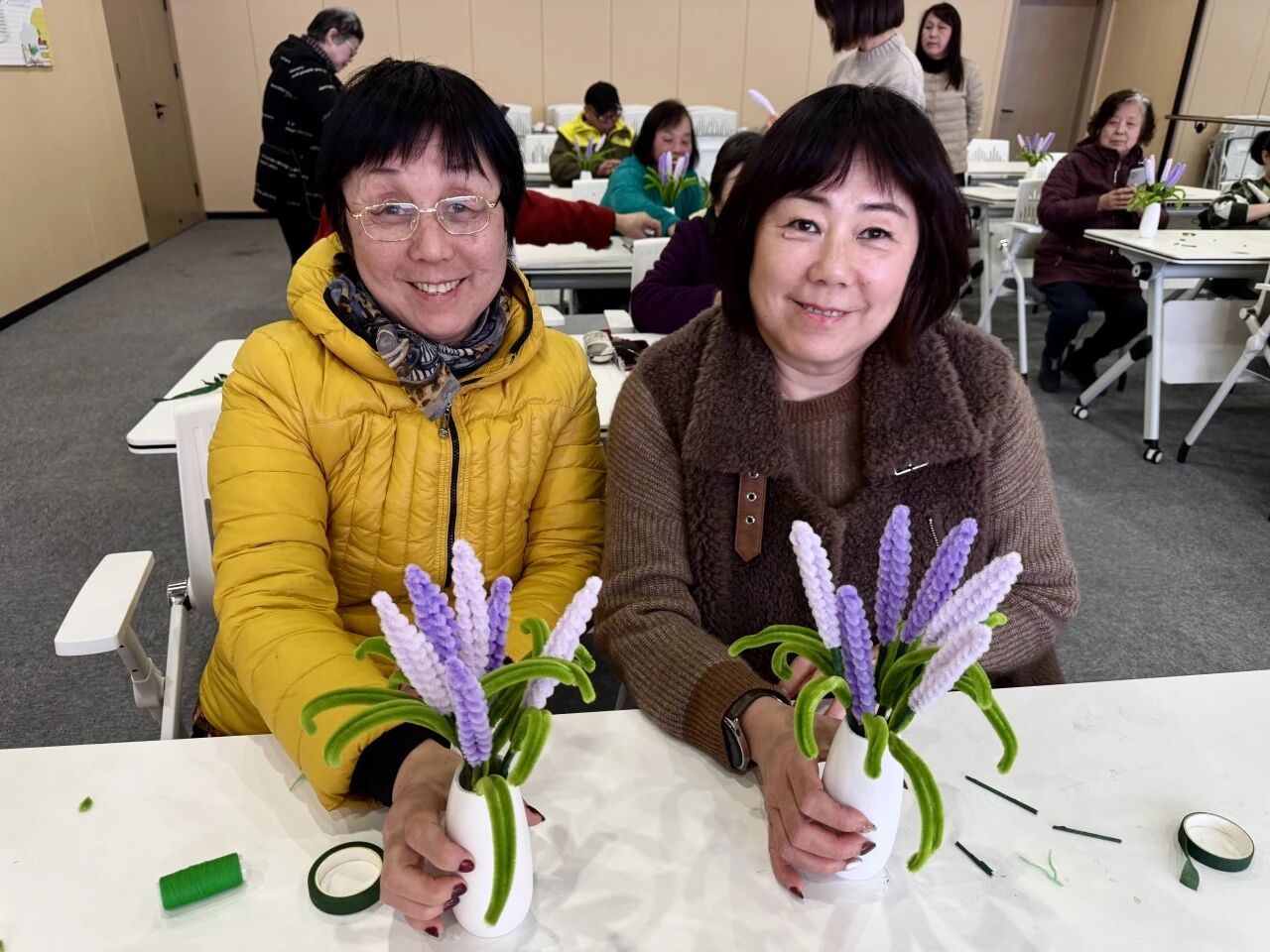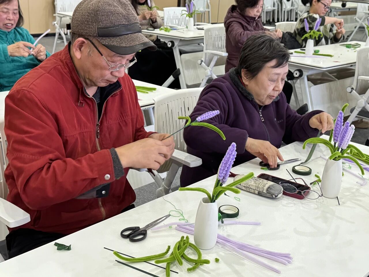 活动现场,深紫、浅紫的扭扭棒搭配嫩绿枝杆、迷你花盆、胶水等制作材料整齐摆放,简约的材料却藏着满满的春日创意。 来自宝山区社区学院的顾老师,结合老年居民的动手特点,将薰衣草小盆景的制作步骤拆解细化,从扭扭棒缠绕的力度、花穗的间距,到叶片的弯折造型、盆景的整体搭配,一步步细致讲解、示范操作。