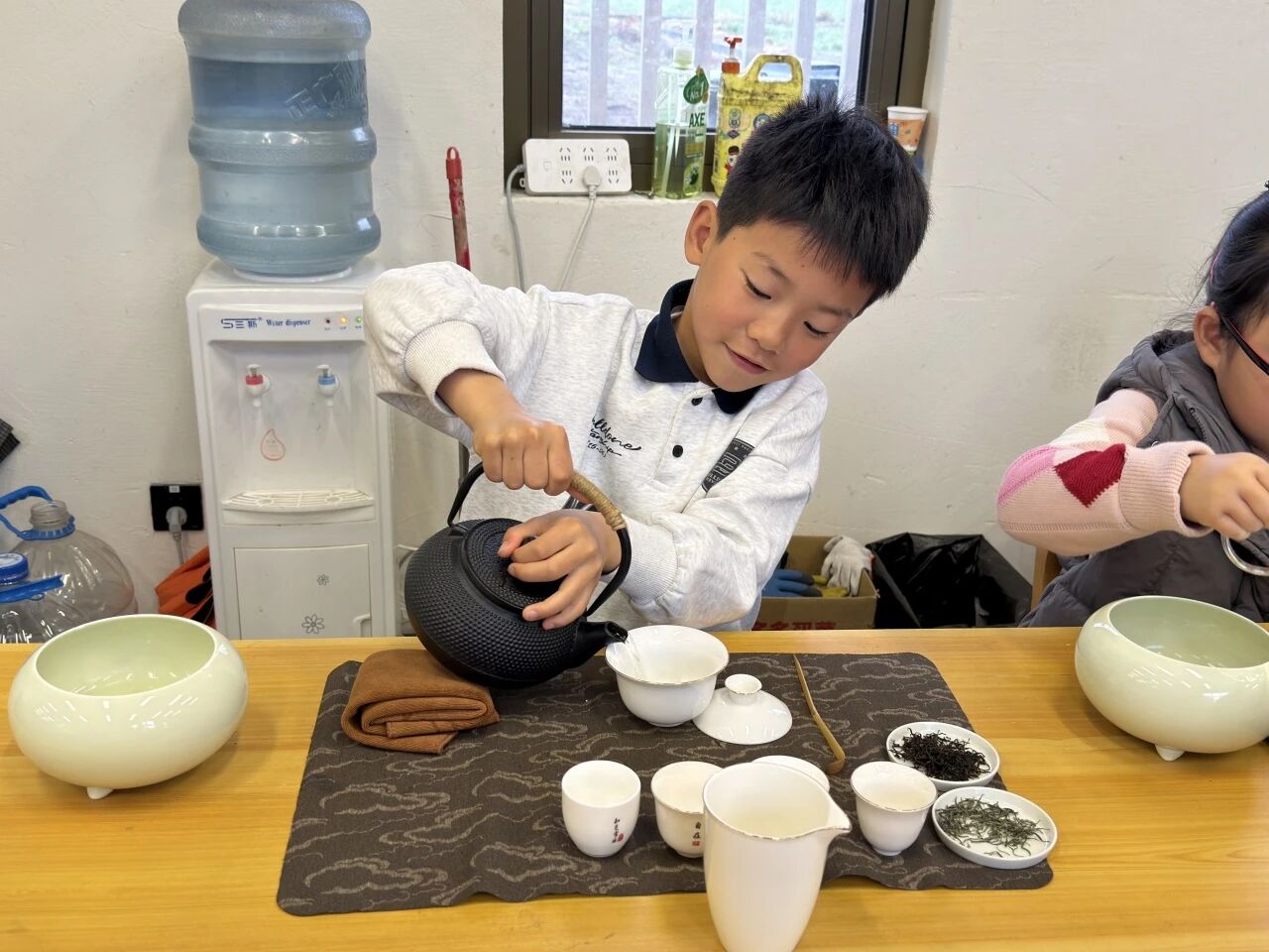 换上素雅新装,孩子们正式“上岗”。温壶温杯、投茶注水、高冲低斟——每一个动作都有讲究。老师告诉他们,茶艺师不只是泡茶的人,更是传递礼仪与文明的人。入座时先尊后幼,冲泡时壶嘴不朝客人,倒茶七分满,敬茶时双手奉茶……这些看似细微的规范,实则承载着礼仪之邦的深厚涵养。对孩子们来说,这是一次真正的职业体验,他们学着像一位真正的茶艺师那样专注、从容、有条不紊。一杯清明春茶,入口微苦、回味甘甜,像极了成长的味道。