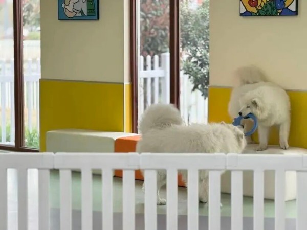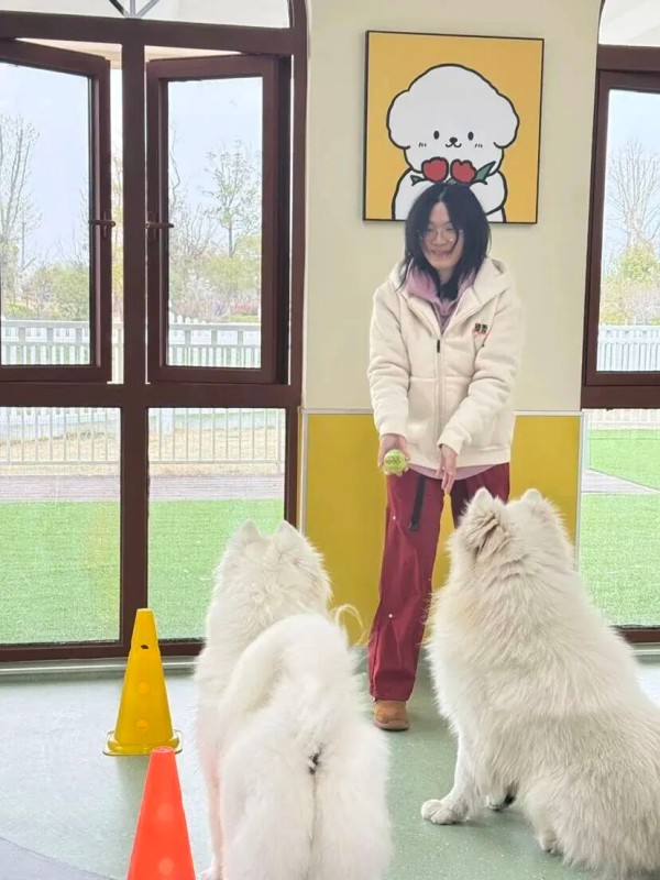 瞧!教室里,两只雪白的萨摩耶正为了一根拔河绳兴奋地蹦跶,撒欢、社交、放电……这里俨然成了汪星人的专属欢乐天地。 宠物主人季先生: