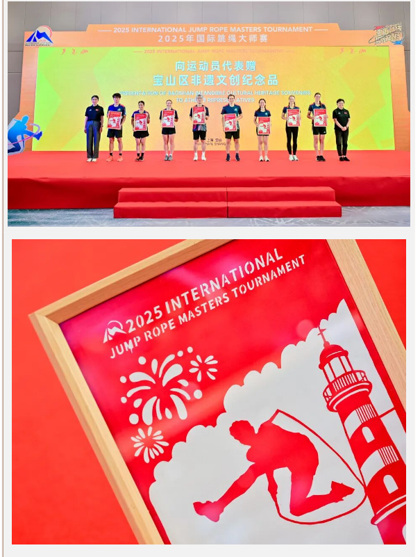 025年国际跳绳大师赛于10月17日至21日在上海宝山新业坊·源创隆重举行。来自全球12个国家和地区的200余位顶尖选手齐聚于此,展开了一场关于速度、力量与艺术表现力的比拼。 大赛创新联动多方面展现非遗文化,打造了独特的“文化名牌”。 在开幕仪式上,舞龙舞狮作为开场节目用熟悉的鼓点和色彩点燃我们中国人刻在记忆里的文化烙印,让人热血沸腾,也向国际友人阐释了“团结协作、和而不同”的东方智慧。 主办方向韩国、澳大利亚、美国、泰国、奥地利、匈牙利、斯洛伐克及中国的参赛运动员代表,赠送了定制的非遗文创纪念品,展现“有朋自远方来,不亦乐乎”大国气度。