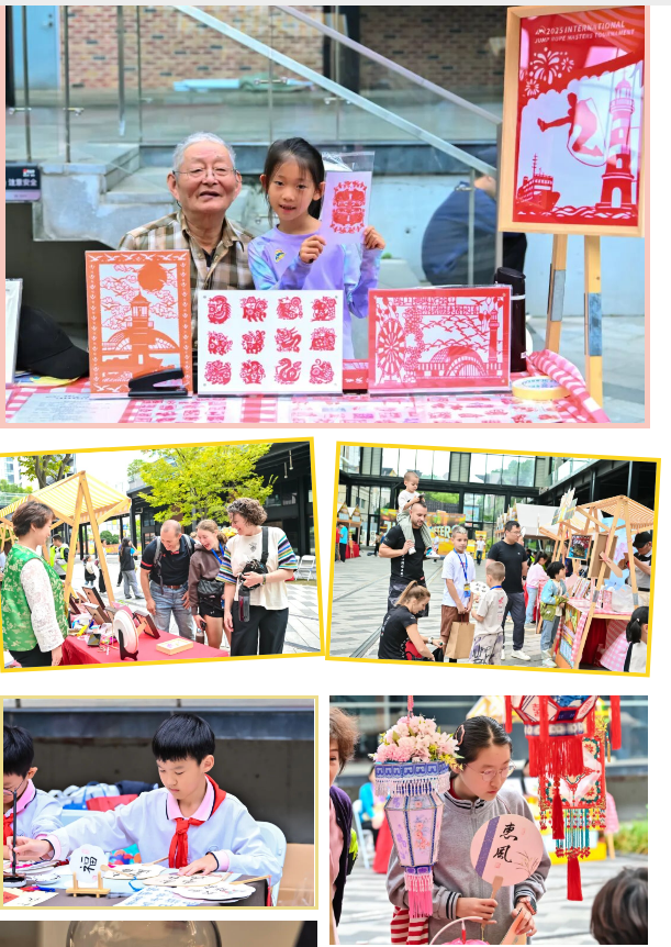宝山非遗文化底蕴悠长,涵盖传统技艺、美术、民俗等多个领域。大赛特别开设了琳琅满目、异彩纷呈的非遗市集,让跳绳体育激情与宝山地域文化共同绽放。市集内设置高境蔡氏剪纸、高境布艺堆画等非遗摊位。 更有许多趣味玩法让人耳目一新,吸引了大批参与者驻足,整个集市内人头攒动、摩肩接踵。在互动体验中,参与者体会触摸得到的技艺,真实可感的匠心,中老年群体不禁产生情感共鸣,小朋友观众们跃跃欲试,外国友人们对精湛工艺叹为观止。