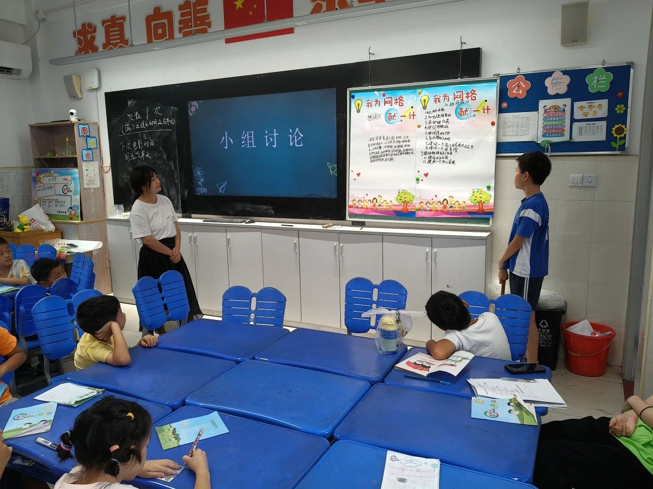 “我觉得网格里的分类垃圾桶可以画些卡通图案,这样小朋友就不会扔错了,还能装扮街区,多好呀!”来自第一组的张同学率先发言,得到了组员们的认同。 “路边人行道经常会损坏,爷爷奶奶们年纪大了很容易绊倒,能不能让修路的叔叔及时处理呀?”第三组的周同学皱着眉头提议,引来一片附和声。