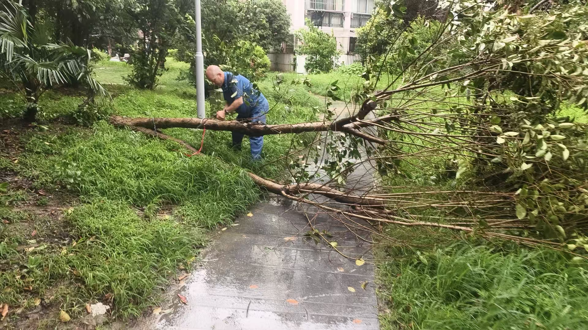 “人行通道有树木倒伏,影响业主通勤,请速处理!”30日凌晨,巡逻保安发现小区中心花园附近的人行通道被倒树阻断。物业人员与保安队伍闻讯而动,携带工具紧急奔赴现场,利用阵雨间歇迅速分割、清运树木,抢在早高峰前排除了险情。