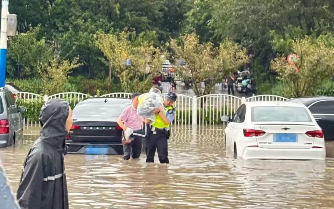 派出所积极与辖区物业公司沟通联系,组建警民治安联防队,联手布控辖区重要部位。每天以巡逻防范为主要手段,对小区的路面和重点部位进行全面防控。民警还深入辖区开展安全防范宣传活动,通过案例讲解、发放宣传材料等形式向辖区群众进行安全防范知识宣传。提醒群众在平时生活中注意防盗、防抢、防诈骗,切实增强自我安全防范意识。 应急处突高效 各方协同聚合力 2025年9月8日,一场罕见的暴雨袭击申城,上海市宝山区宝杨派出所辖区路面严重积水,交通陷入瘫痪。危急时刻,宝杨派出所民警朱杰毫不犹豫冲上一线,在暴雨中筑起一道坚不可摧的“蓝色防线”,用行动诠释“安全就在身边,满意源于用心”的庄严承诺。“警察同志,小朋友刚刚手术康复,我老头子又抱不动,这水这么深,我实在没办法!”暴雨赶上放学高峰,来接孙女的老大爷无奈之下向护校民警求助道。民警朱杰刚和同事将熄火汽车推到安全区域,便又再次蹚入水中继续救援。