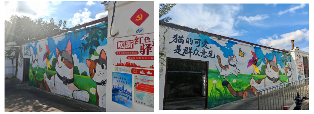 在手工DIY环节中,小哥们用彩砂、香薰精油和各种装饰材料制作个性化的香薰蜡烛。每一层砂粒的选择、每一个装饰的摆放,都成为情绪表达的载体。一位参与活动的小哥感慨道:“平时风里来雨里去,很少有机会停下来关照自己。这次活动像是一次‘充电’,让我感觉被看见、被关心了,这里真的很温暖。”这场活动,不仅是技能的传授,更是一次真诚的邻里关怀,用专业而温暖的双手,抚平了心灵的褶皱。 内心的暖流需要滋养,共同的家园也需要妆点。在新业坊·源创园区内的暖新驿站有这样一只由园区、园区企业、新就业群体共同领养的流浪猫,这只可爱的猫咪,早已成为连接园区每个人的情感纽带,是大家共同的“毛孩子”,也被大家亲切称为“猫站长”。高境镇社区党群服务中心以此为契机,与殷高街区党总支、园区运营方、园区企业以及新就业群体,一起拿起画笔,开展了一场以猫为主题的的“墙面美化”活动。