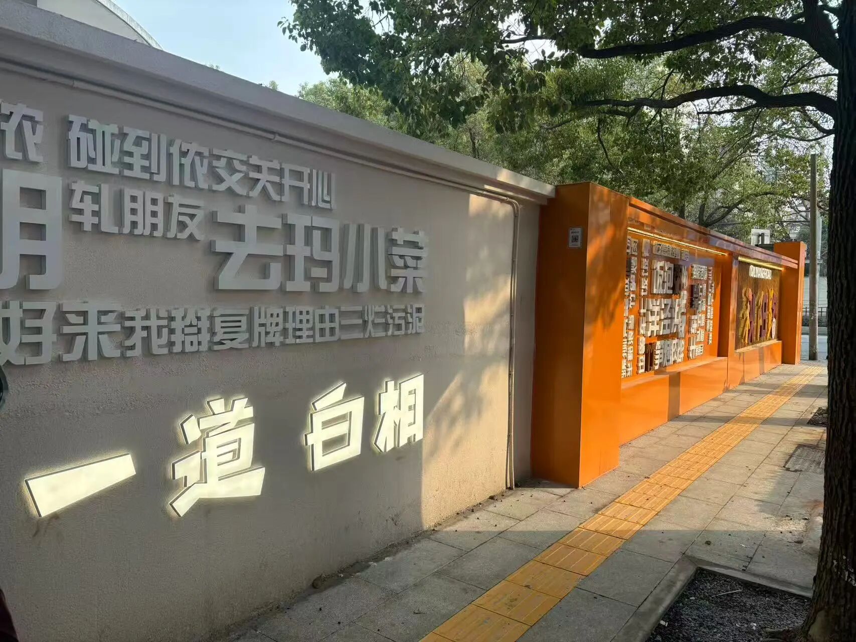 此次改造聚焦路面提质与功能完善 打出一套组合拳: 车行道通过洗刨加罩、局部翻挖新建 解决路面破损问题,让行车体验丝滑顺畅 人行道和侧平石焕新升级 专门选用防滑耐磨、生态环保的材料铺装 让行人散步、骑车都安心又舒心 道路两侧的树穴也迎来“精致变身” 改造后边线清晰、覆盖整齐 既给树木生长留足了空间 又为街道添了一抹清新雅致的韵味 原先斑驳破旧、杂乱不堪的围墙 经过清洗修复和贴面美化 摇身变成街头 “颜值担当” 统一的色调和细腻的质感 勾勒出简洁大气的视觉美感 更具巧思的是 路口专门打造了一面上海白话墙 “今朝真开心,难板碰个头”“头五头六” 充满烟火气的沪上俚语跃然墙上 搭配醒目的 “秋阳路” 三个大字 瞬间让整条路的生活气息拉满
