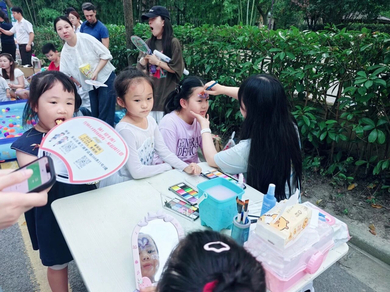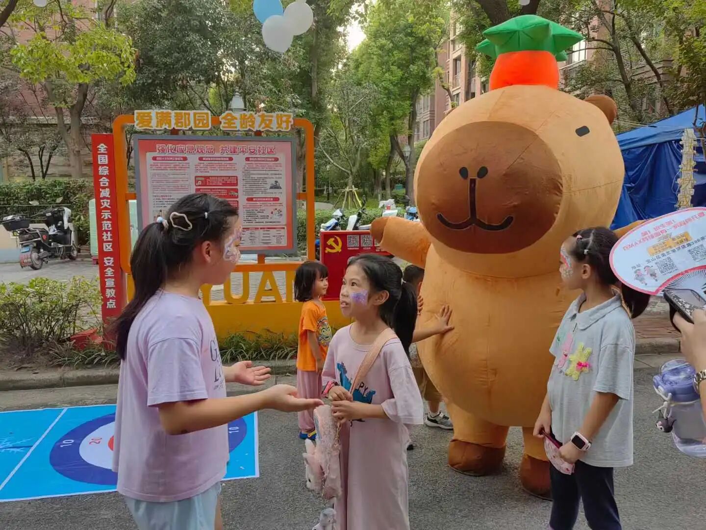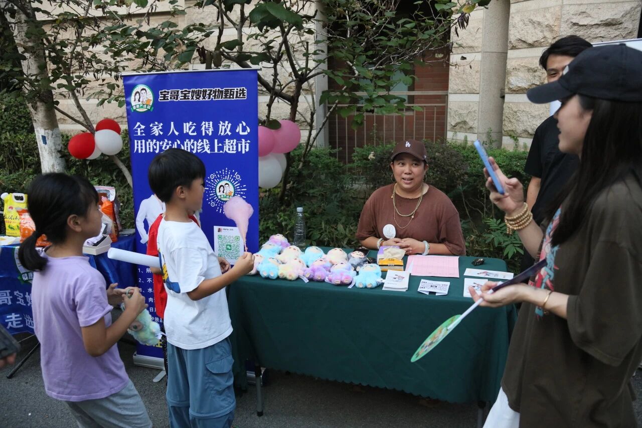 大润发设展架推优惠,居民扫码可领专属券;优优小王国家庭影像馆的摄影师扛着相机走进小区,为现场活动提供摄影服务,为社区居民定格温馨瞬间;小爱心舞蹈提供课程咨询,还可预约庆典专属体验课;悦庭主打“买1送1”,菠萝包、奶茶、生煎成热门选择;蝶子甜品推出“6元抽甜品盲盒”活动,吸引不少居民参与;美兰湖极真空手道设体验区,教孩子基础防身动作;远方好物陈列农产品并讲解产地故事;硒都山泉设免费饮水站;睦邻食堂以惠民价供应热乎餐食;牙科诊所免费为居民测牙菌斑、普及护牙知识。商户们各显神通,居民们吃得开心、玩得尽兴、学得实用,不少商户还收获了“回头客”。