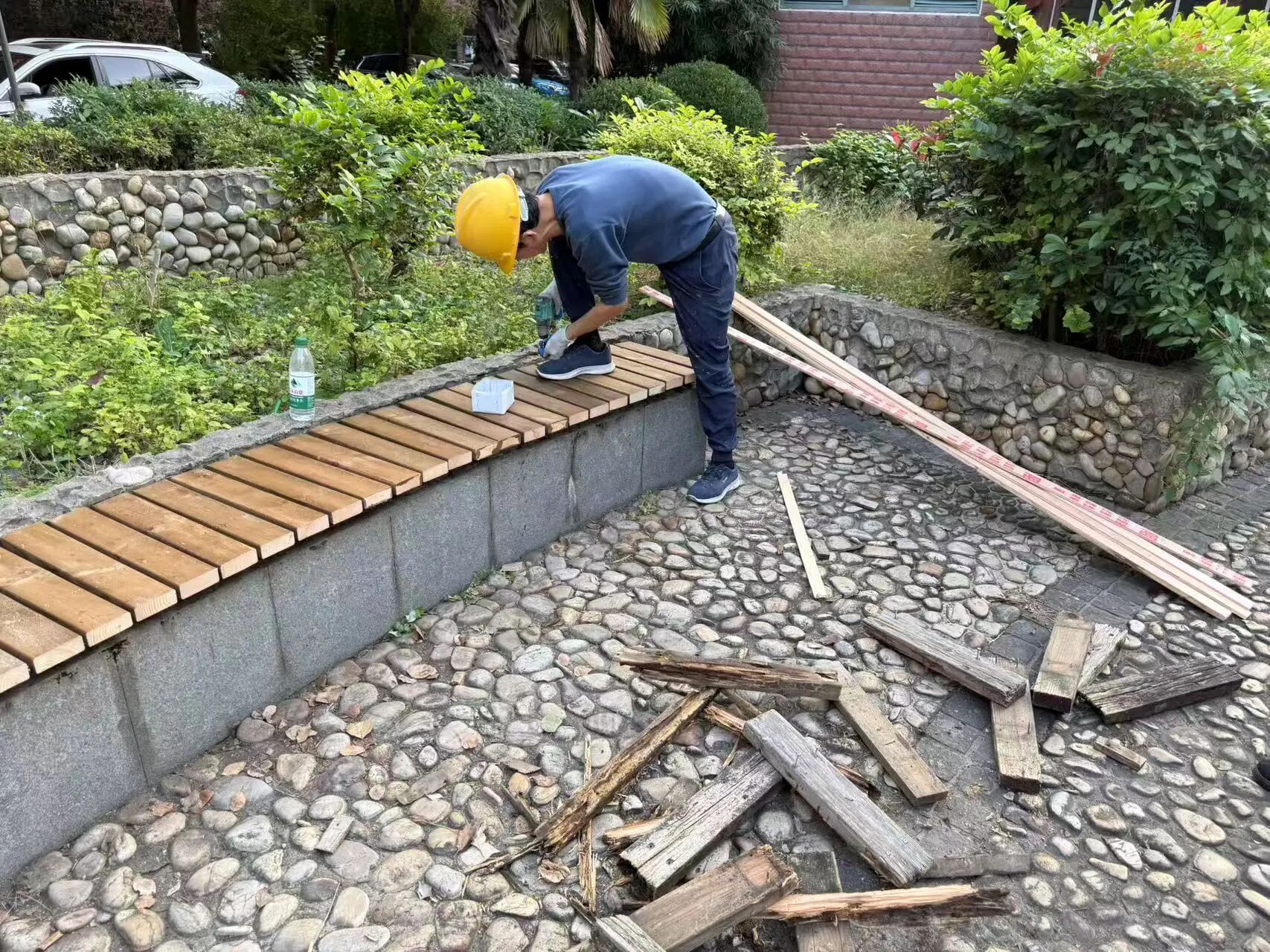 在妇女议事会上,妇联执委、巾帼志愿者们围绕“耐用性”“实用性”“美观度”展开讨论,大家结合日常观察提出不少意见和建议。在与棋牌角“资深玩家”爷叔们的座谈中,更收集到了关键诉求:“下棋时手容易沾到茶水,木质桌子一受潮就发霉,最好用防水防滑的材料”“长椅要结实,能经得起多人同时坐,还要防腐耐用”。 根据协商议事,小区花园公共设施微改造项目得以敲定。不仅更新使用防滑石材的棋牌座椅,并根据实际情况选用防腐木材的休闲长椅。每一个细节,都藏着居民对美好生活的期待。 为了让项目稳稳落地,高境五村居民党总支制定了精细的项目实施计划,从经费申请、材料选购、改造质量监督、后续维护保养,每一步都有小区志愿和居民们参与,确保居民能随时了解项目动态。