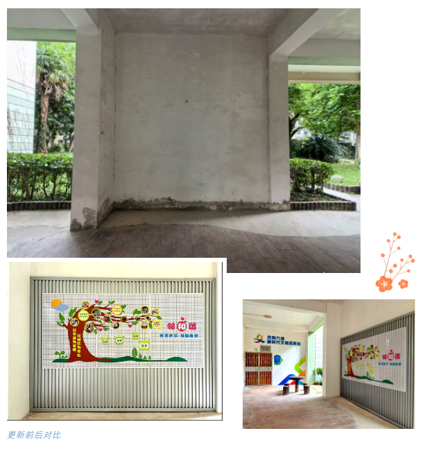 此次微更新中,社区特意在新时代文明实践站打造了一面“共治大树”主题墙。树干上镌刻“党建引领”“以民为本”,一片片“叶子”则生动展示了物业、志愿者、居委会、业委会四方协同的场景、邻里互助的温情以及社区活动的欢笑。这面墙,不仅是展示窗口,更是将党建引领具象化、让治理共识可视化的精神地标,效增强了社区的凝聚力和认同感。
