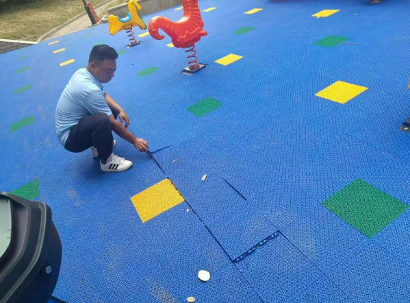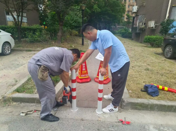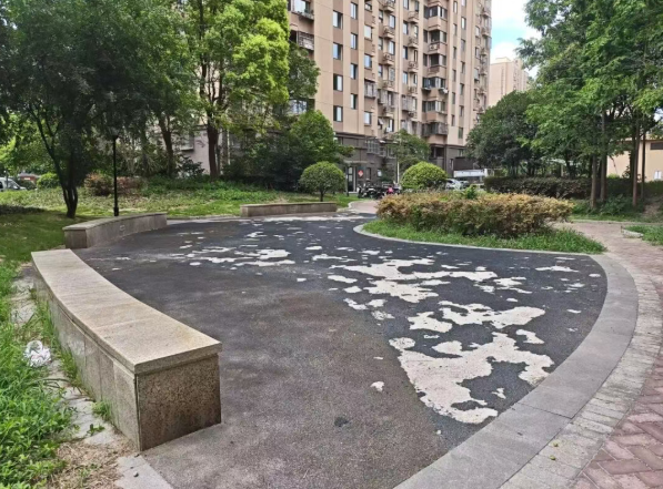在铺设地坪过程中,一个突出的问题逐渐显现:由于小花园周边道路是小区居民日常通行的道路,部分居民驾驶电瓶车频繁碾压到刚铺设好的地坪,导致新铺设的地坪出现不同程度的损坏,不仅影响了地坪的施工质量与美观度,还延误了整体施工进度。针对这一问题,“三驾马车”议事会迅速商讨解决方案,最终确定了“设置路障+加强提醒”的双重解决措施。一方面,在进入小花园的各个路口,合理设置醒目的路障,提醒、引导居民自觉绕行,避免电瓶车对地坪造成进一步损坏。通过上述措施的有效实施,地坪施工工作得以顺利推进。