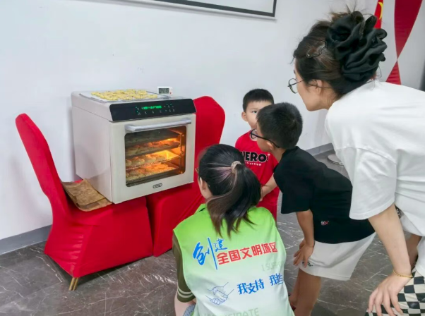 制作环节,孩子们发挥天马行空的想象力捏制面团,各种可爱造型悄然生成。烤箱预热的“嗡嗡”声、孩子们的笑声、家长们的叮嘱声交织在一起,空气中弥漫开阵阵香甜。