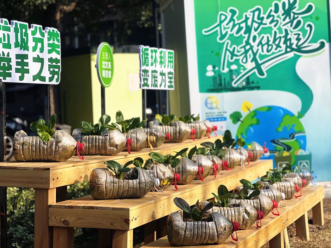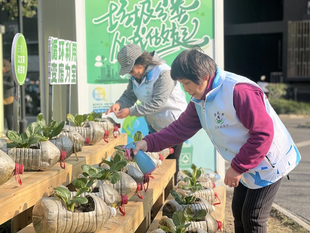 一是打造文明宣传新阵地,邀请专业彩绘达人团队,在小区门头背面绘制色彩鲜艳、通俗易懂的垃圾分类宣传画,以生动形象的图文引导居民养成分类好习惯;在门岗部分墙面创作文明养犬主题彩绘,倡导文明养犬新风尚,让墙面成为传递文明的“活教材”。二是树立社区文化新地标,在小区大门口醒目位置增添“群英慧 邻里守望”大型LOGO,将社区团队精神内核融入视觉符号,强化居民的归属感与认同感。三是开辟绿色生态新空间,以“垃圾分类 变废为宝”为理念,打造“绿色环保一米小菜园”,引导居民将厨余垃圾转化为有机肥料,种植各类蔬菜瓜果,既实现了垃圾资源化利用,又为社区增添了一抹绿意,成为居民体验农耕乐趣、共享劳动成果的“幸福园地”。