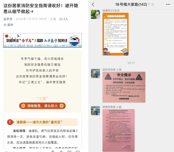 为深入落实本市“四百”大走访排查整治火灾隐患工作要求,罗店镇迅速响应,自1月9日起,在辖区范围内全面启动消防安全大排查、大整治专项行动。行动紧密围绕防火安全核心,充分整合各方力量,依托“四百”大走访工作机制完成全域覆盖排查,在持续开展特殊困难群体消防关爱走访的基础上,进一步结合“四百”大走访,深化对行动不便人员、独居老人等六类重点人群的消防关爱行动,通过上门检查、安全宣传、设施维护等多种形式,切实保障人民群众生命财产安全。 深入走访,织密排查“责任网” 各居民区严格坚守“排查与整改同步、安全与关怀并重”原则,日常巡查靶向发力,聚焦建筑外墙、屋顶、地下车库、配电室、水泵房等高火灾风险部位,加大巡查频次,做到发现隐患、立即处置、不留死角;专项管理从严落实,坚决杜绝电动车“进梯上楼”、违规充电等高危行为,规范动火作业全流程监管,每日常态化巡查疏散通道与安全出口,全力保障生命通道畅通无阻。通过“日常巡查+专项管控”双发力,切实将消防安全管理融入日常、抓在经常,为居民筑牢长期稳固的安全防线。  温情守护,筑牢关爱“安全网” 各居民区在扎实开展隐患排查的同时,重点聚焦孤寡、高龄老人等特殊群体,让安全走访更具民生温度。工作人员入户后,不仅细致检查老人家中电气线路、燃气设备等关键安全点位,手把手讲解消防安全知识,提醒日常用火用电用气注意事项,更主动关切老人生活需求,提供力所能及的帮助。从排查安全隐患到普及安全常识,从询问生活近况到解决实际难题,居委用一次次贴心走访、一句句暖心叮嘱,把安全守护和人文关怀送到居民心坎上,让消防安全工作既有力度,更有温度。  全域宣传,强化安全“防护网” 各居民区通过转发“金罗店”发布的消防安全知识、社区云平台发布相关信息、居委干部转发宣传要点到各居民楼组群、线下电子屏滚动播放安全标语、小喇叭播报防护要点、传单入户普及安全知识等方式,让消防安全理念深入人心,让隐患排查整治家喻户晓,切实凝聚“人人讲安全、户户重防火、社区共守护”的共治合力,筑牢罗店平安防线。   下一步,罗店镇各居民区将持续绷紧消防安全之弦,常态化推进隐患排查整治,持续深化“安全+关怀”服务模式,用脚步丈量责任,用行动守护平安,切实让居民住得安心、过得舒心。 |