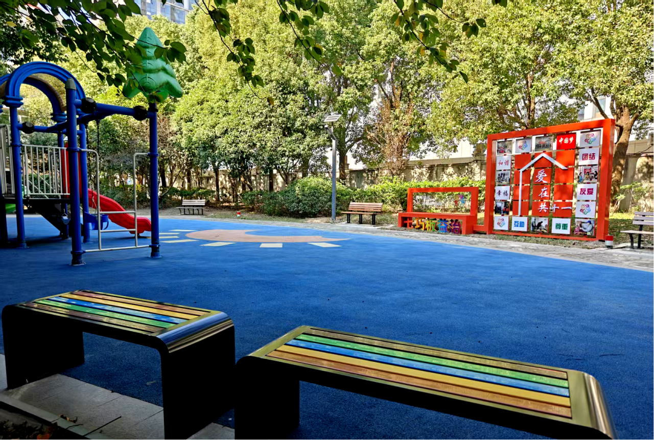 共和新路4739弄的小花园微改造,正是“七巧板”协同发力的一次生动实践。 共治板牵头,倾听民声:改造始于“共建共治板”通过议事角收集的居民心声——“缺温度、少活力”。 多板块联动,各展所长:项目启动后,“公益服务板”动员志愿者参与清理、彩绘;“活力楼组建设板”发动周边楼组居民出谋划策;“温馨守护板”则考虑为老人增设舒适座椅。每一个细节,都有多块“板”在背后支撑。 拼出“七巧板乐园”:荒芜的空地“拼”上了色彩斑斓的跳房子格子;斑驳的旧椅“拼”上了彩虹般的新衣,成为“彩虹座椅”;闲置的角落“拼”出了充满童趣的指示牌和品牌宣传栏……这些新增的“板块”,与原有的游乐设施巧妙拼接,最终组合成一个充满巧思与温度的崭新空间——“七巧板乐园”。它不仅是一个游乐场,更是一个微缩的社区共同体模型。