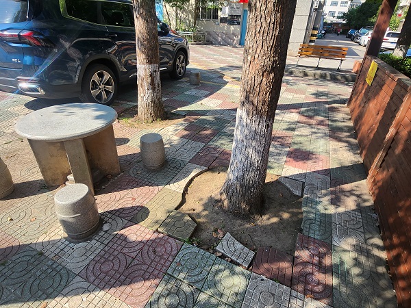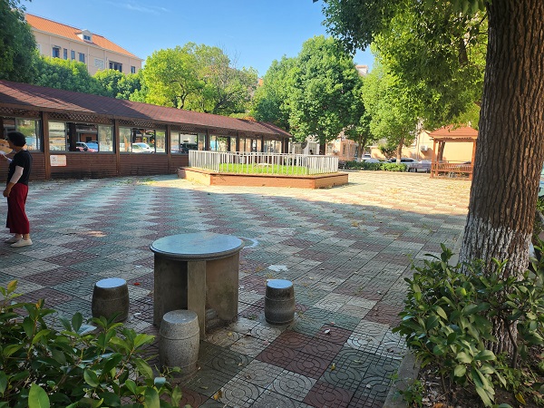 宝钢一村中心花园广场,曾是小区里人气最高的公共空间,可随着年久失修,渐渐成了大家的“烦心事”。广场地面地砖松动翘起,坑洼不平,老人散步得步步留心,生怕崴了脚;孩子们想在广场上跑跳嬉戏,家长也得寸步不离盯着,就怕磕着碰着。更让人头疼的是,广场中央那处大花坛,不仅花草枯萎毫无观赏性,还占了大半活动空间,居民想跳个广场舞、打个太极,都得挤在狭小的角落里。